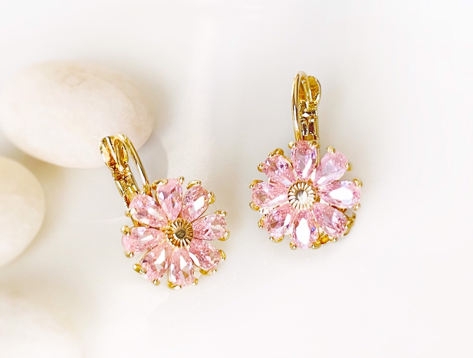 Pink sapphire gemstone daisy flower lever back earrings. These created pink sapphire flowers are set in 18K white, 14K rose gold or 14K yellow gold plated over brass. Each daisy flower is 0.5 inch in diameter. These earrings are lead and allergy free.