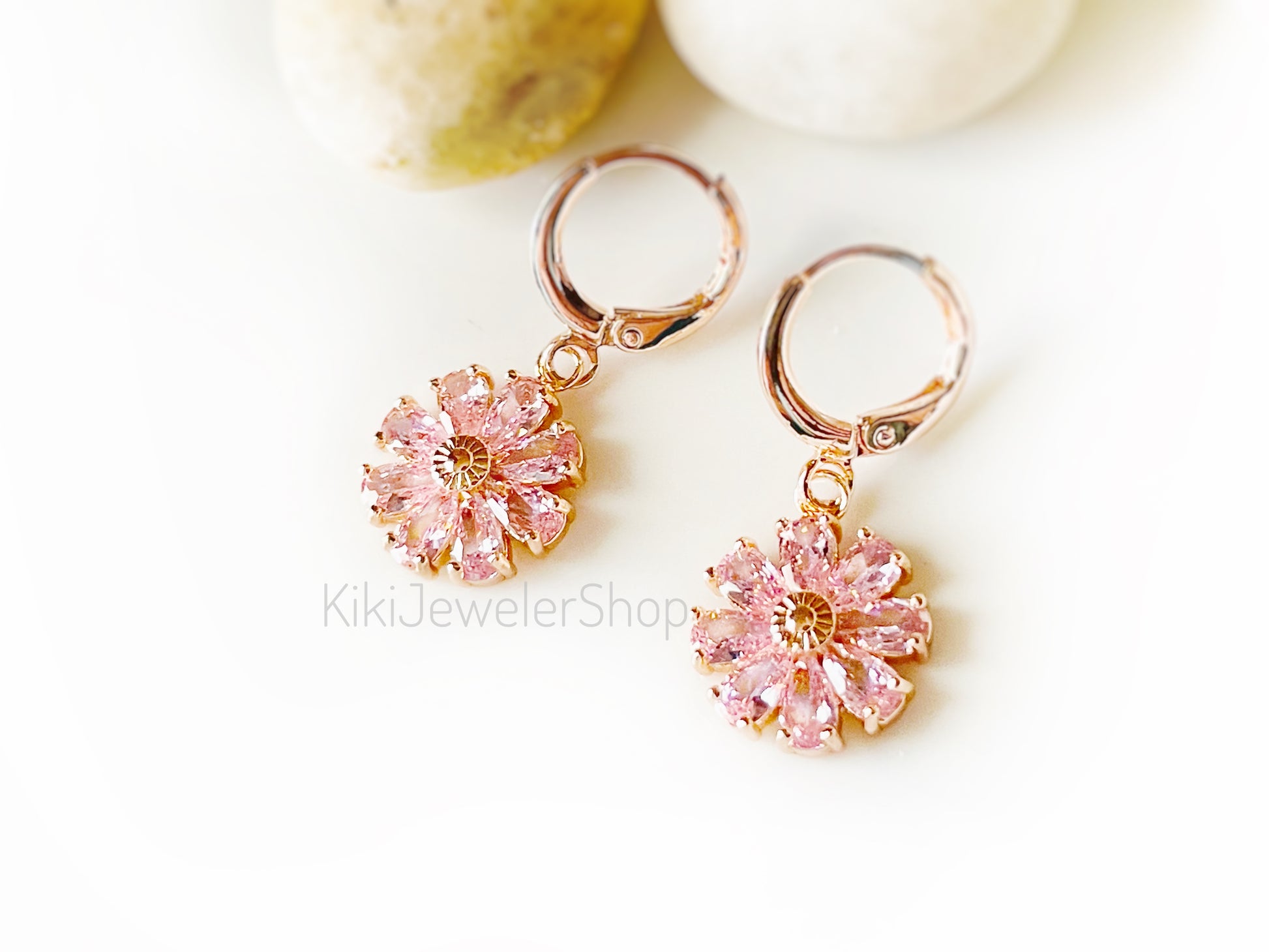 Pink sapphire flower leverback dangle earrings, pink gemstone daisy flower earrings, October birthstone, gift for mom, gift for her