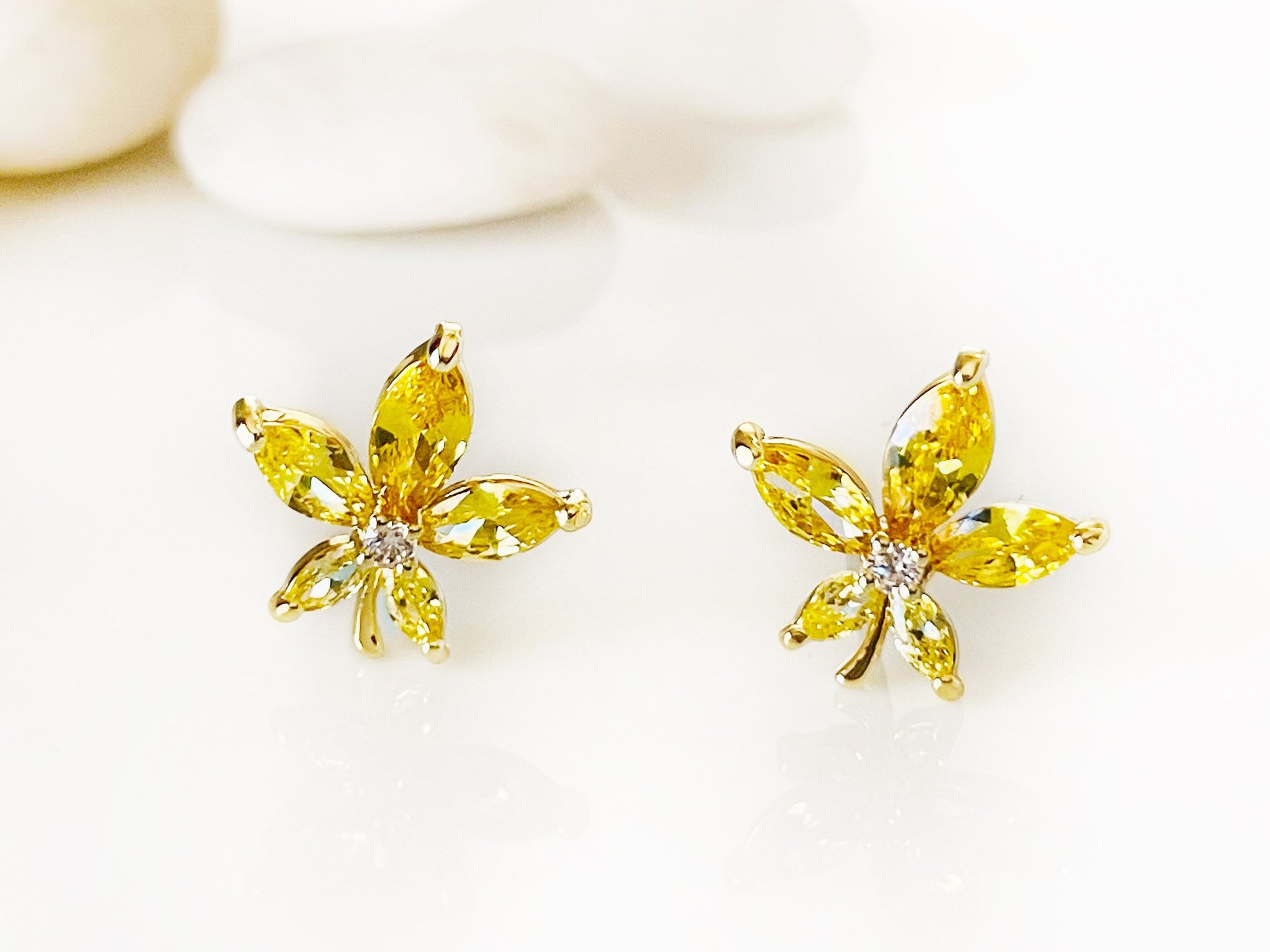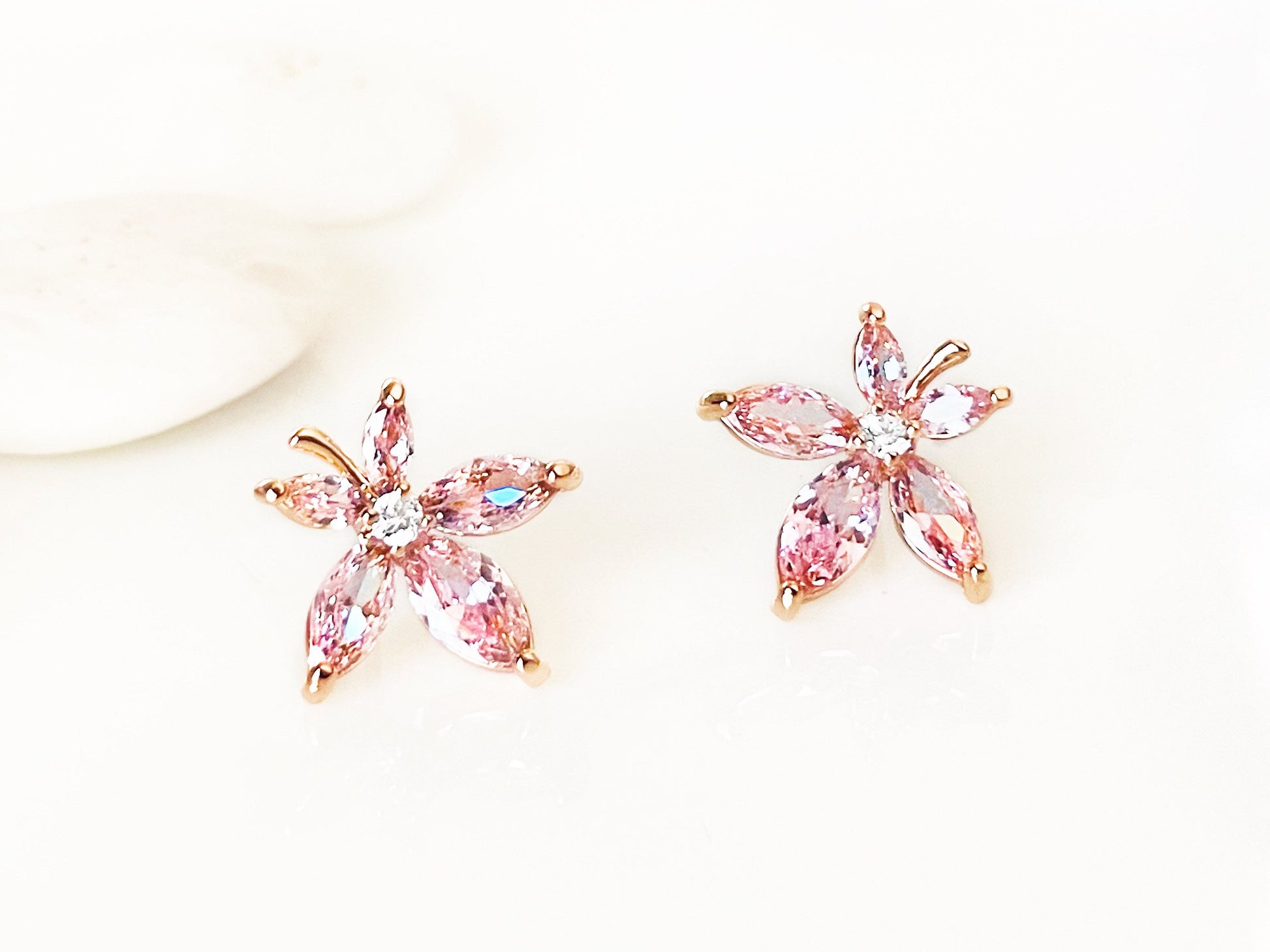 Beautiful maple leaf stud earrings with Marquise cut created pink sapphires. Each earring measures 14mm diameter. They are casted in 14k rose gold over brass. The stones were cut for maximum sparkles!