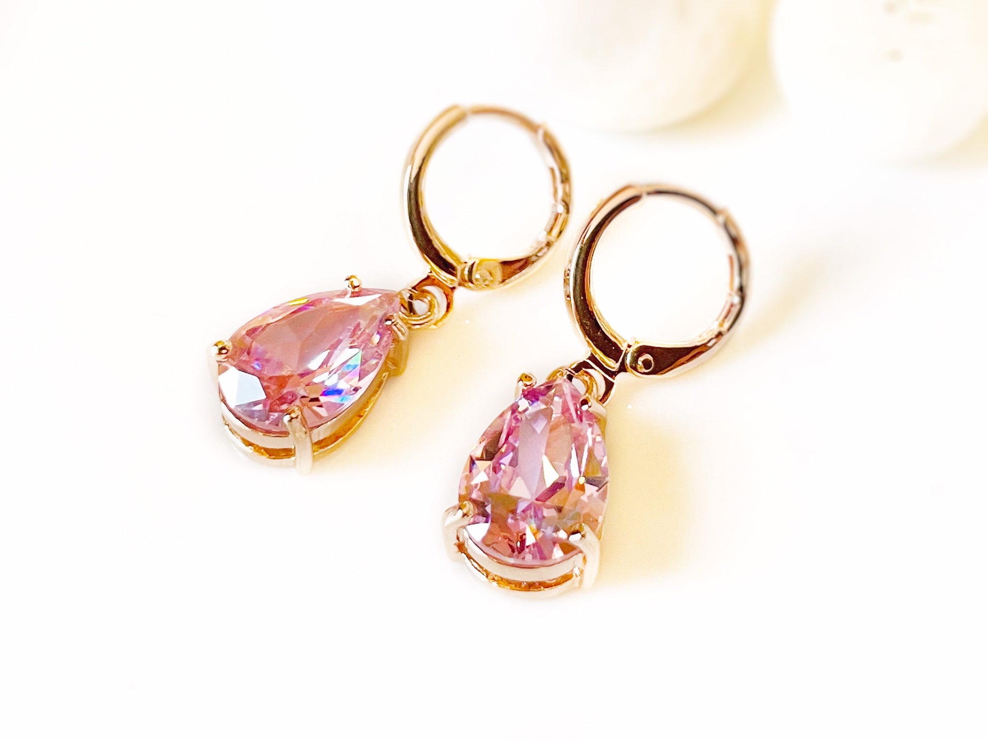Pink sapphire teardrop huggie dangle earrings white gold, Pink gemstone earrings, October birthstones, gift for her, gift for mom