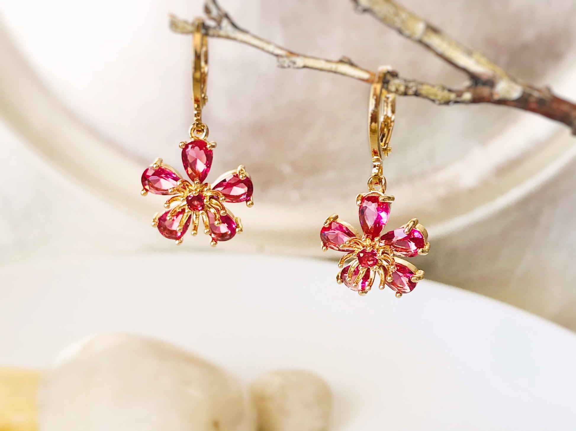 Created pink tourmaline daisy flower with 5 faceted pear shaped stones set in 14K gold plated over brass dangle from small gold filled huggie. Each daisy flower is 12mm / 0.5 inch drops from a small huggie. Lead and nickel free
