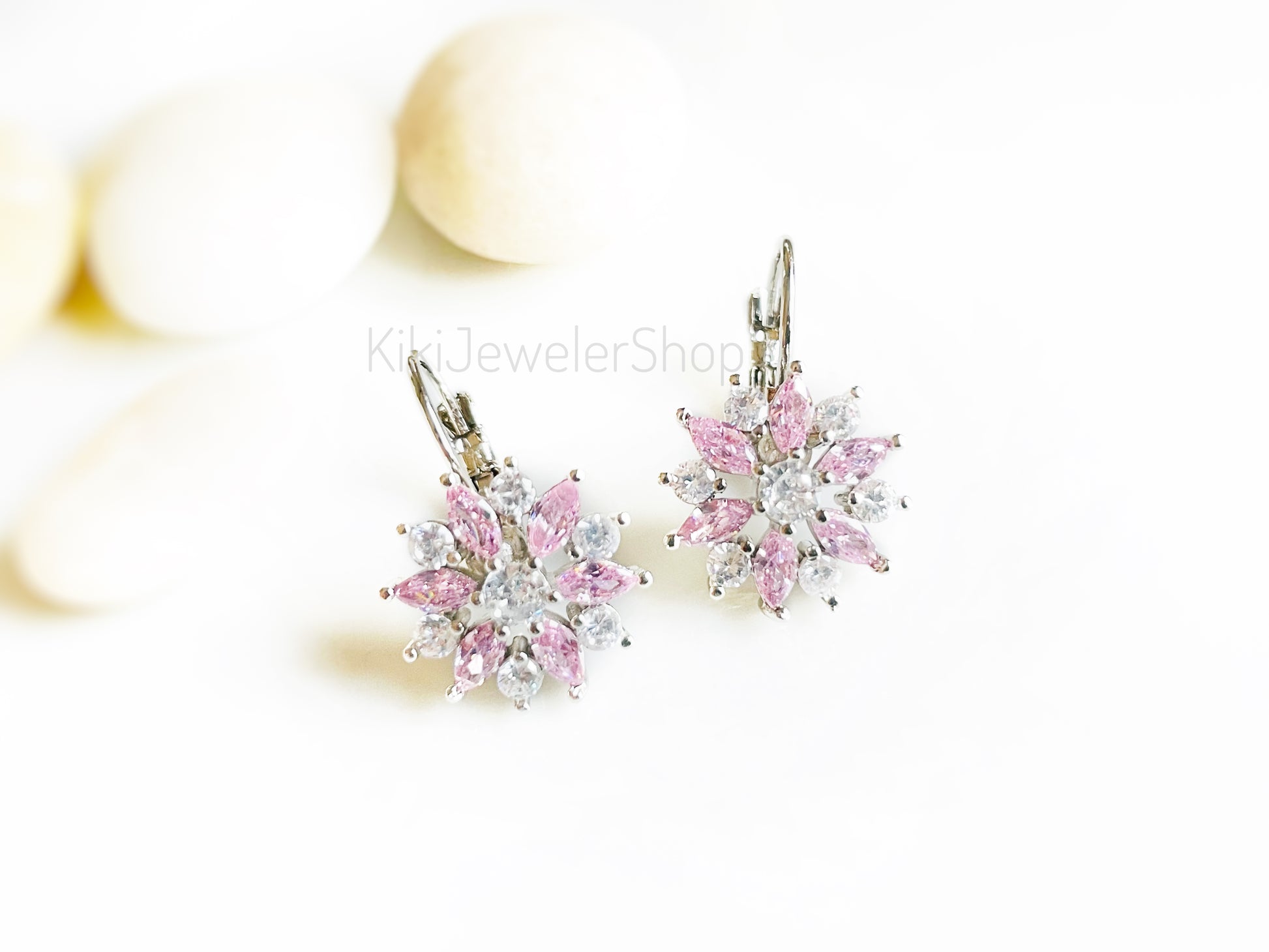 Pink+White Sapphire Snowflake Flower Leverback Earrings