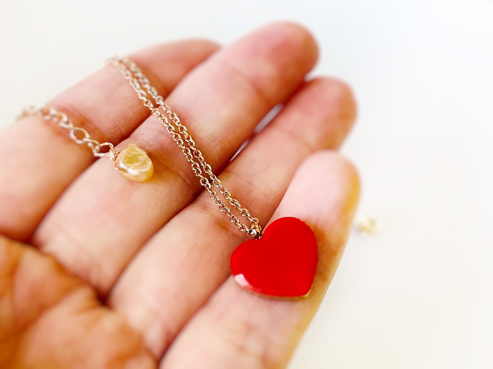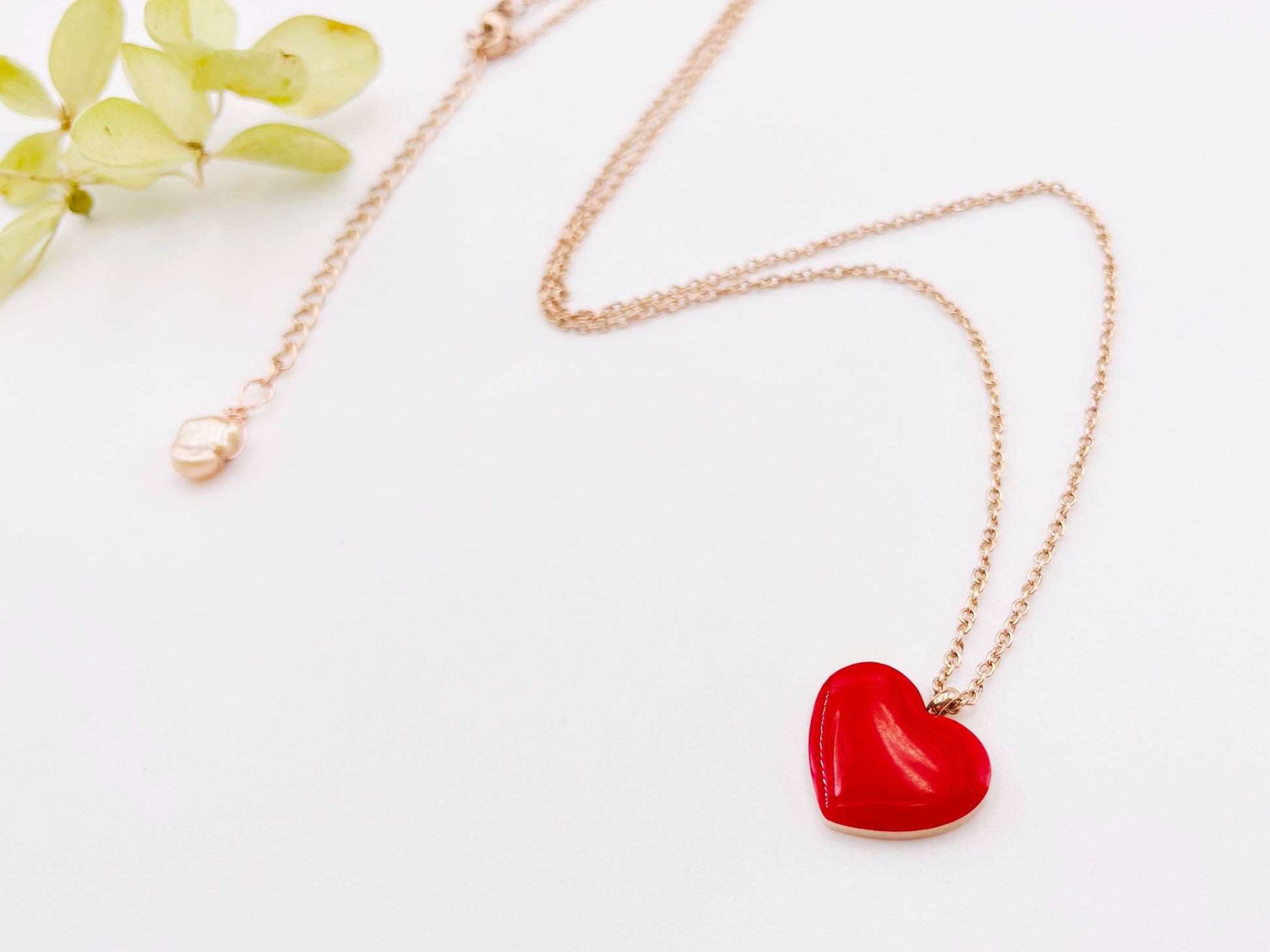 Lacquer red heart shaped pendant necklace in 18K rose gold filled. This necklace is made of the highest quality materials.