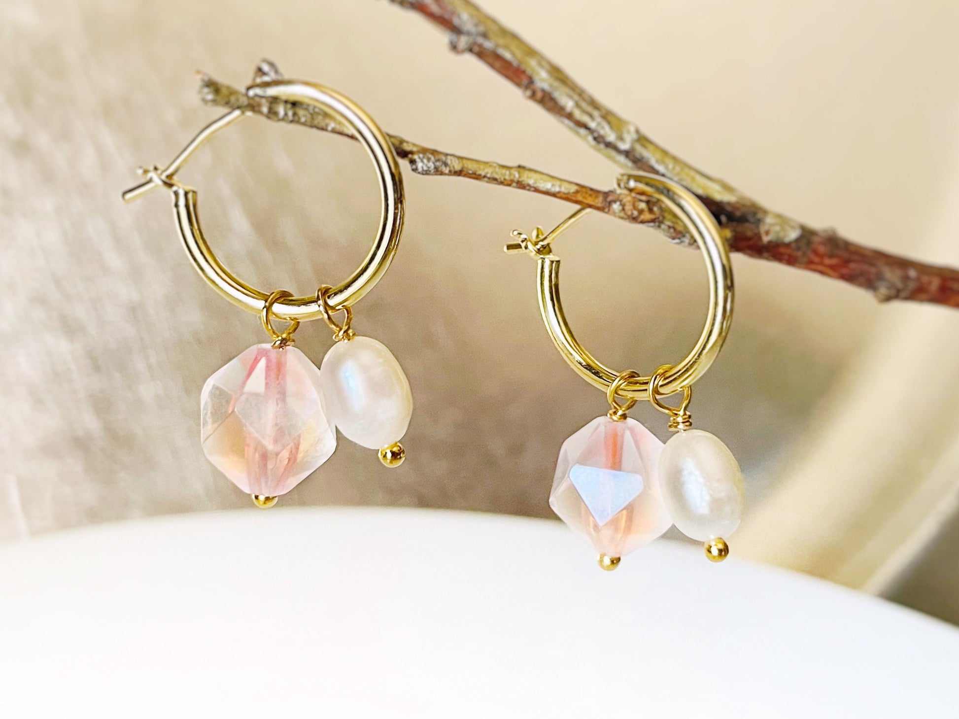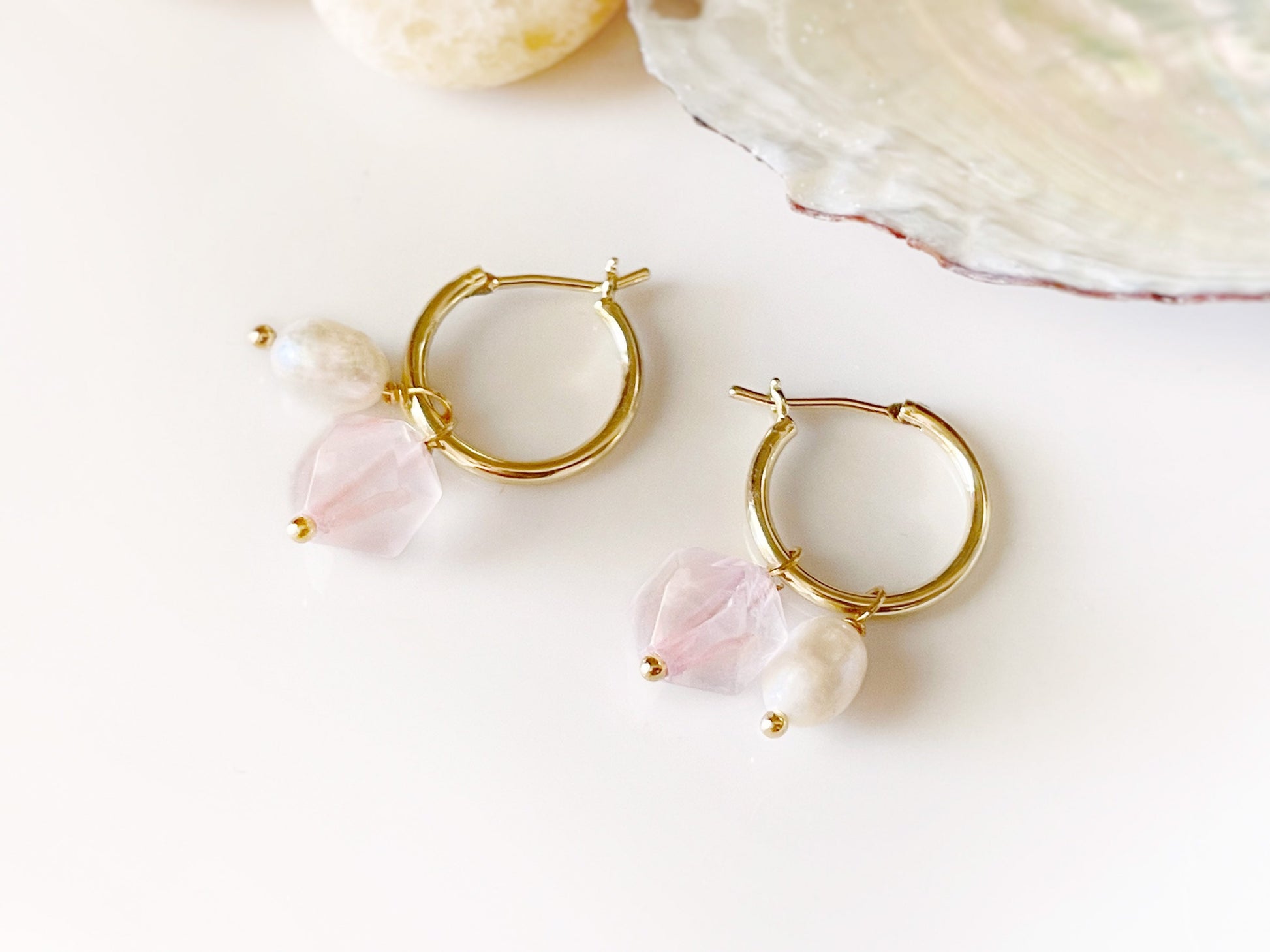 Natural 10mm rose quartz faceted beads and 7x5mm freshwater pearls dropped from 18mm (0.75”) hoops in 14K gold filled over brass. Lead, nickel free and allergy free.