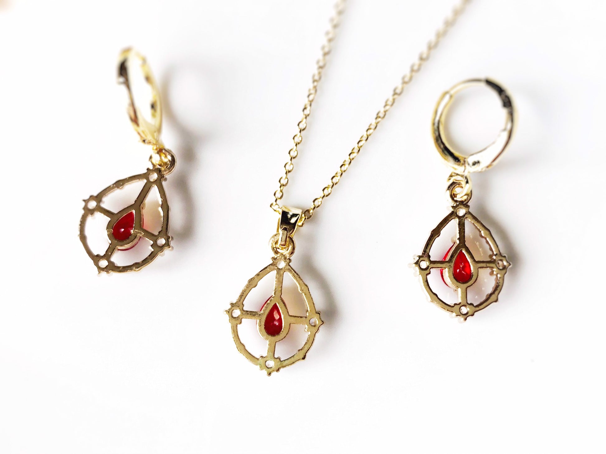 Ruby and white sapphire jewelry set in 14K gold, necklace earrings set, gift for her, gift for mom, July birthstone