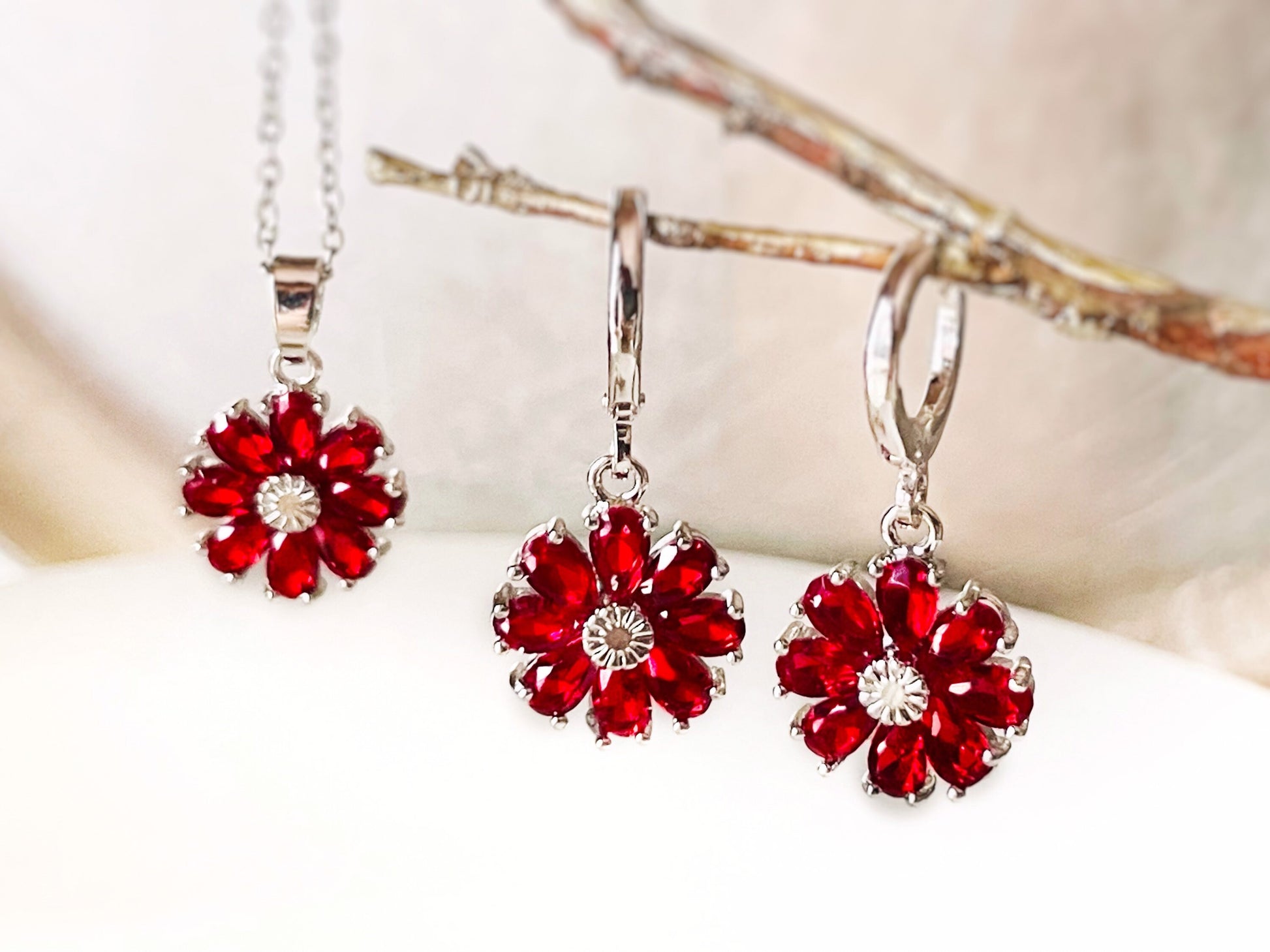 Ruby daisy 2pc jewelry set, ruby red gemstone flower
