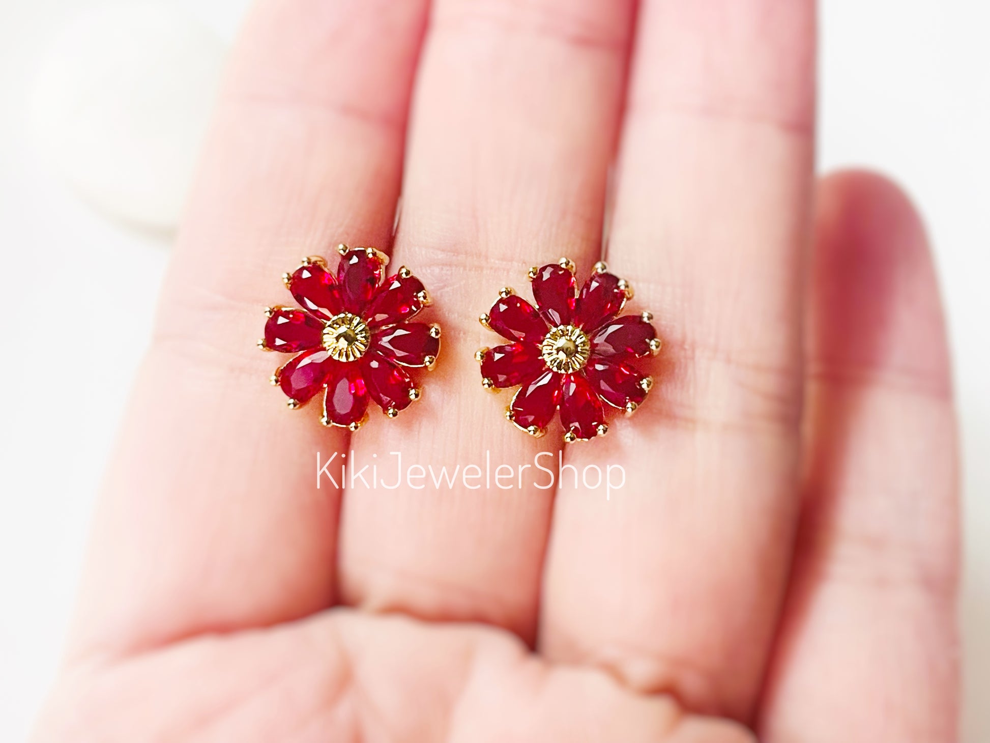 Ruby Dainty daisy flower gemstone dangle earrings lever backs. These created red gemstone flowers are set in 14K gold filled and 18K white gold filled. Each daisy flower has 8 small pear shaped faceted stones with lots of sparkles.