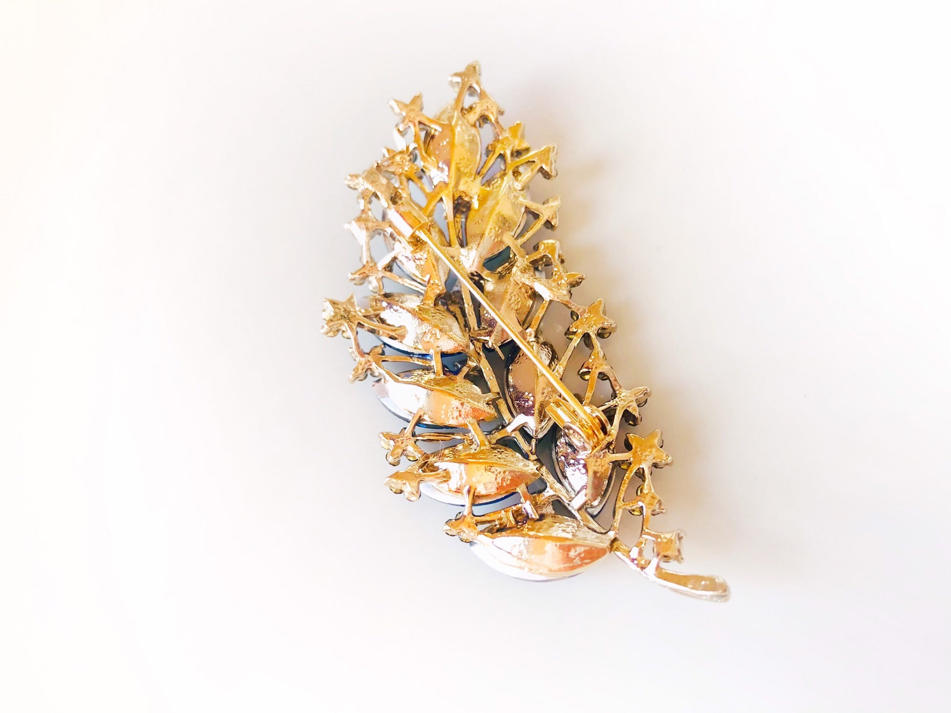 This beautiful large statement brooch is designed to resemble leaf in marquise cut sapphire blue and smoky grey Crystals. It’s outlines with small cluster of crystal flowers in the same colors in 9K rose gold plated metal.