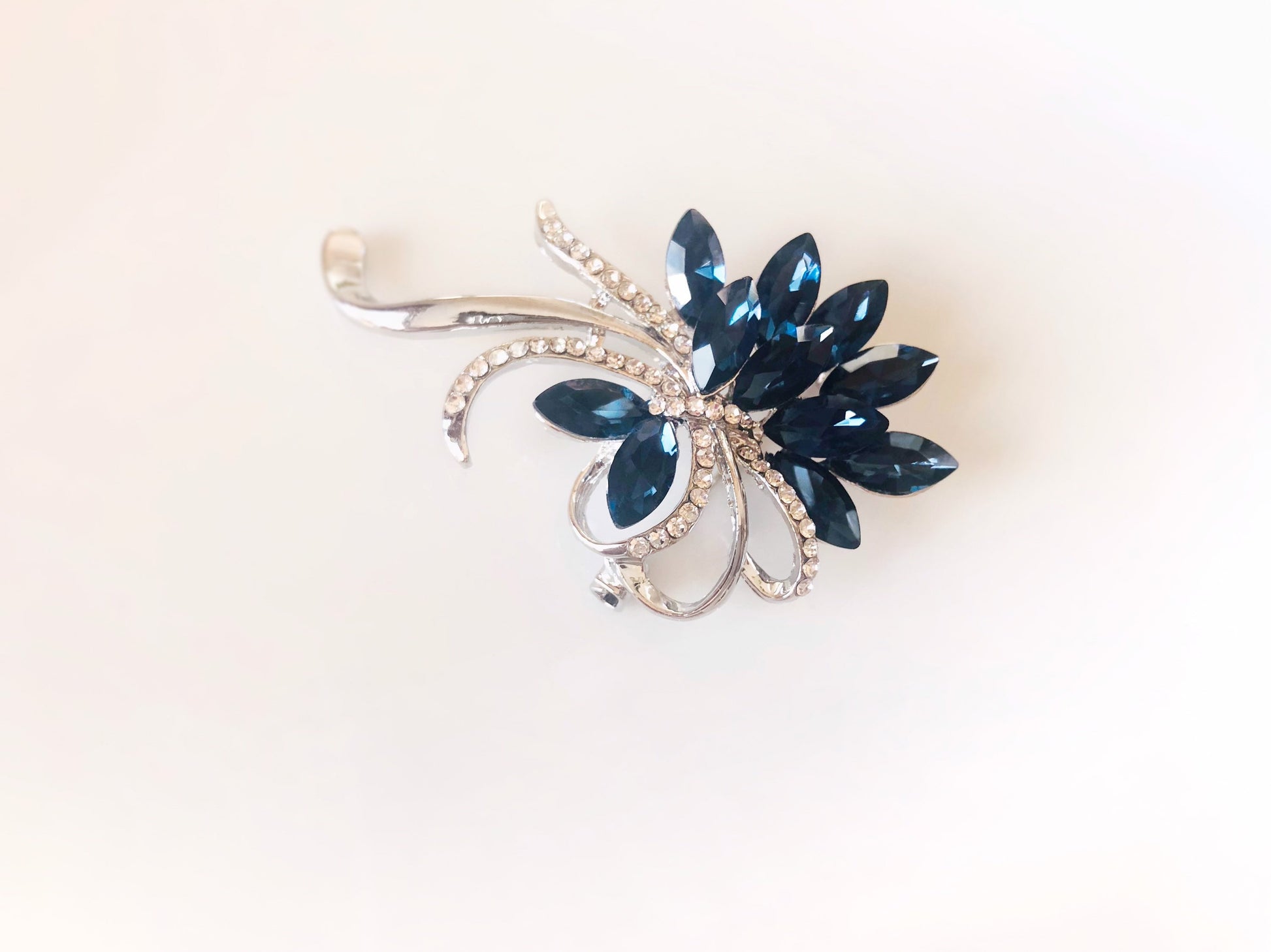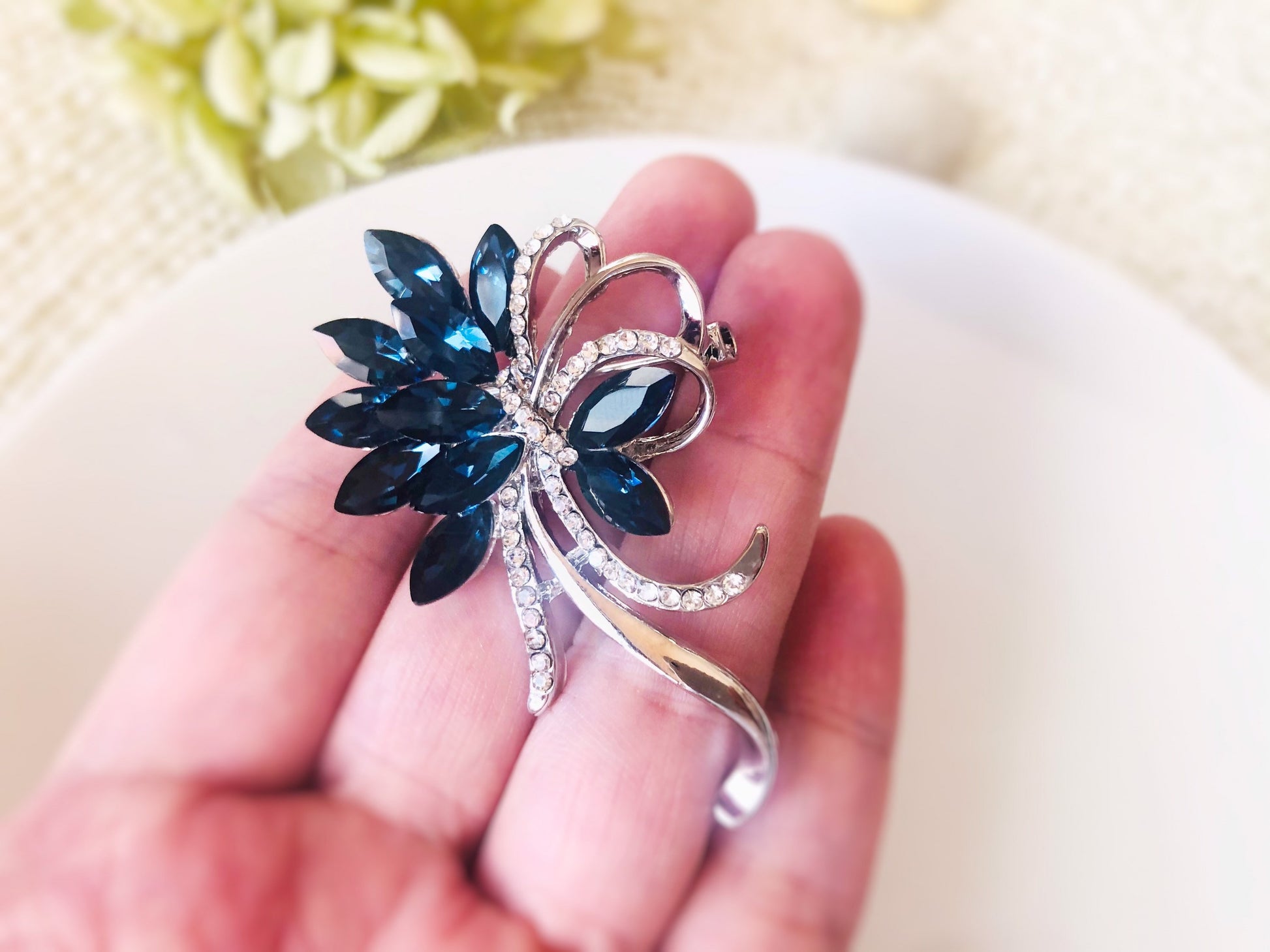 Blue sapphire and white crystal floral bouquet handcrafted in 18k white gold rhodium. This brooch features smooth, graceful lines and beautiful colors that compliment any wardrobe