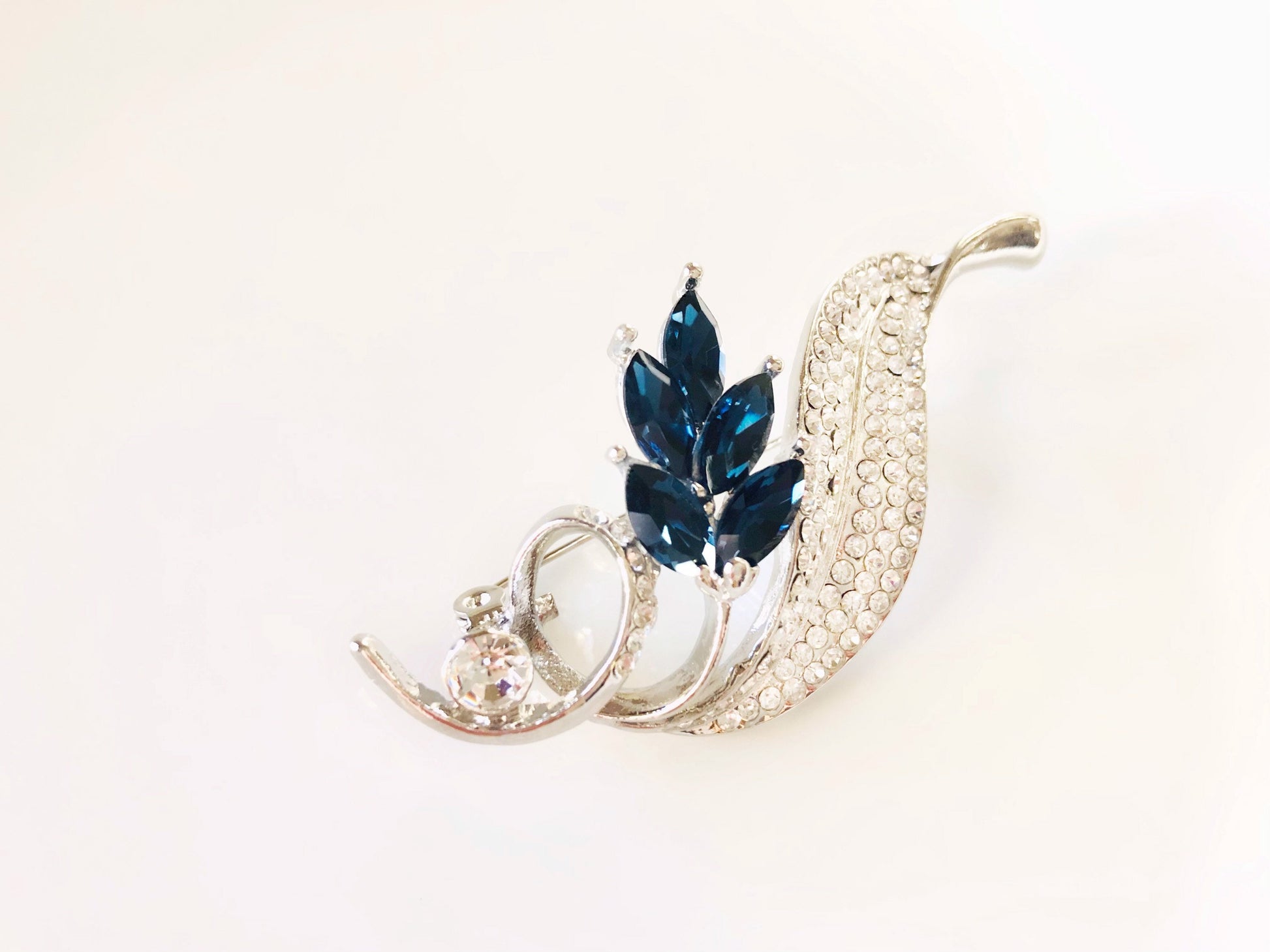 Blue sapphire and white crystal stem flower handcrafted in 18k white gold plated. This brooch features smooth, graceful lines and beautiful colors that compliment any wardrobe