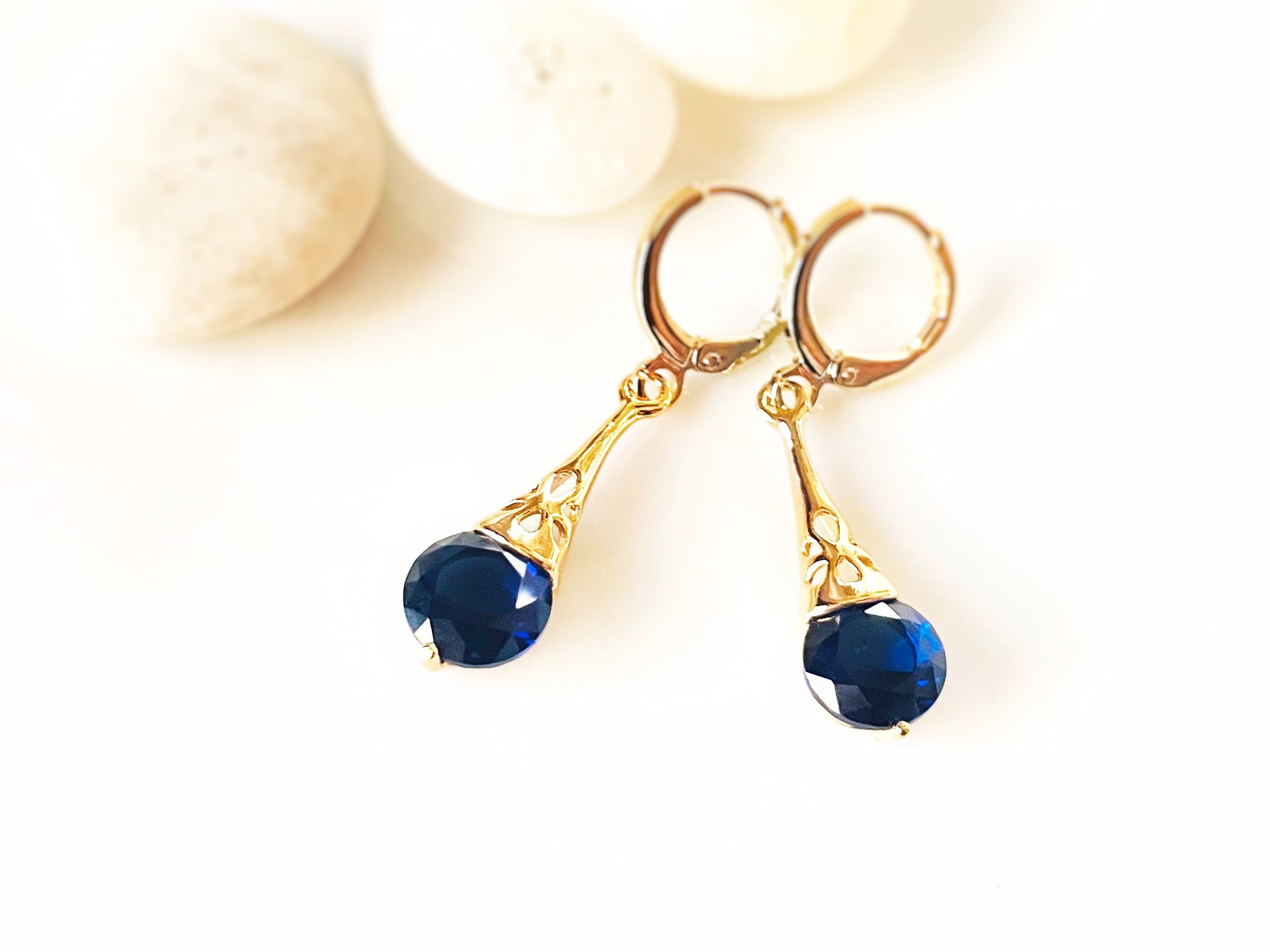 Small filigree sapphire dangle earrings with 12mm huggies set in 14k yellow, 14k rose gold or 18k white gold over brass. These created blue sapphire gemstones are 8mm brilliantly faceted for maximum sparkles.