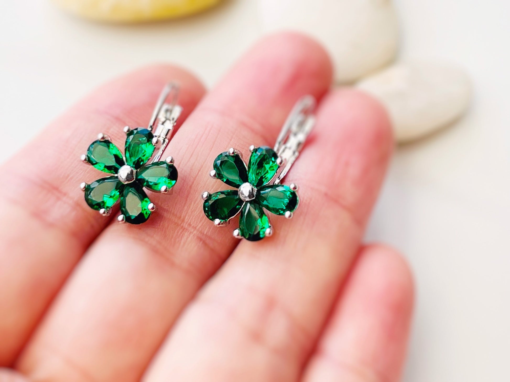 Blue sapphire flower dangle earrings in real 18K white gold over brass. These beautiful earrings each has 5 (7x5mm) faceted pear shaped simulated blue sapphire gemstones. The sapphire flower measures 0.5 inch. They are dainty and light weight.