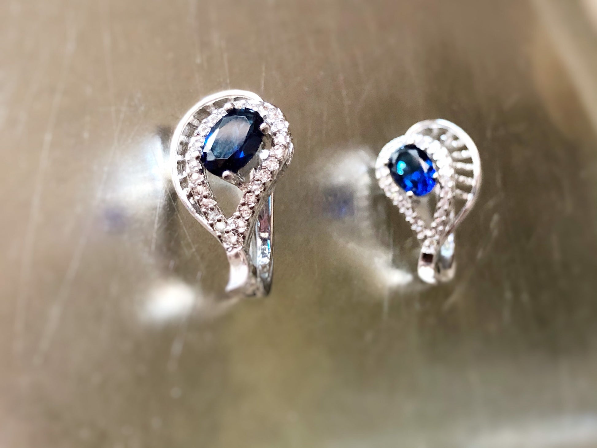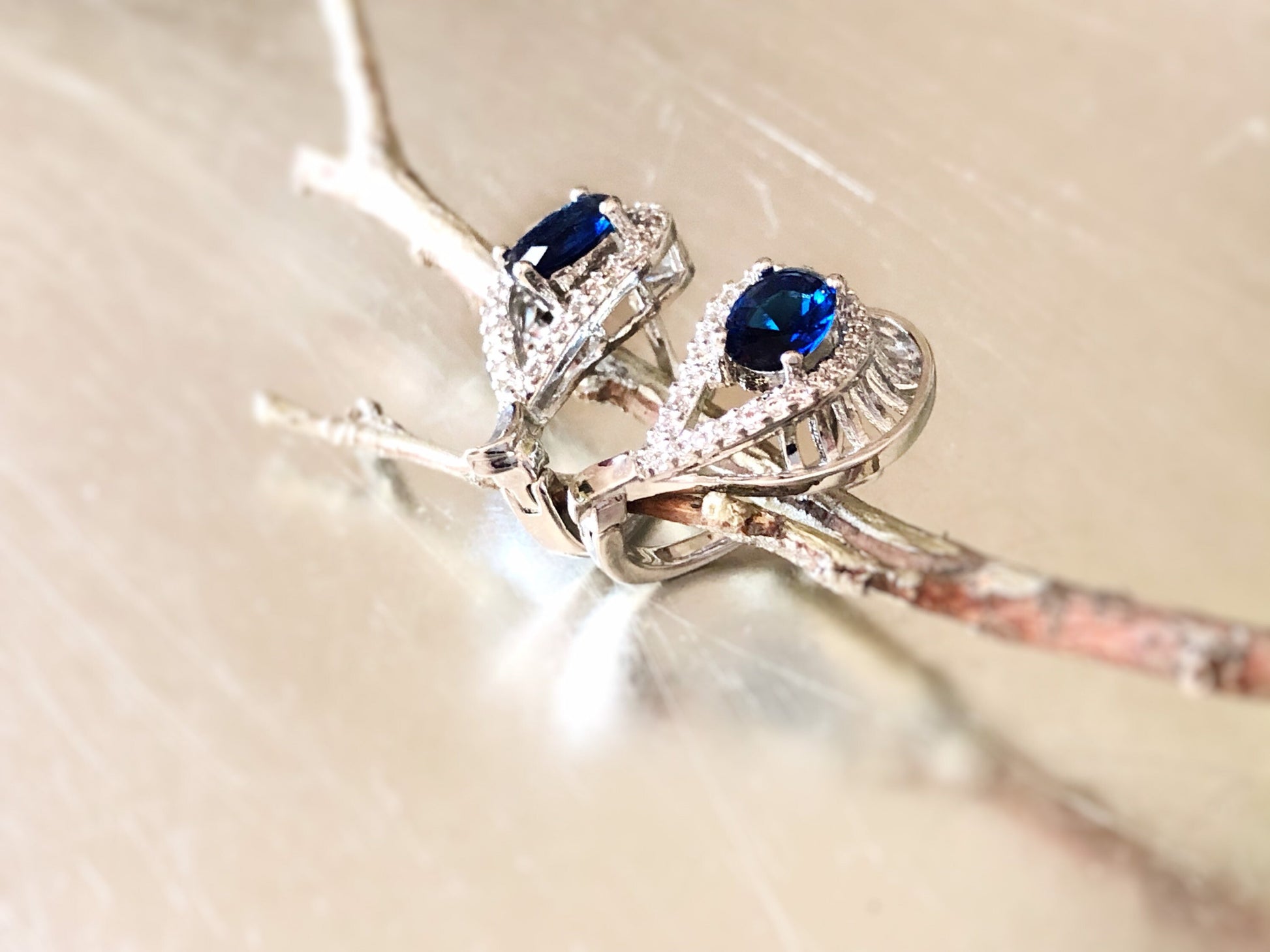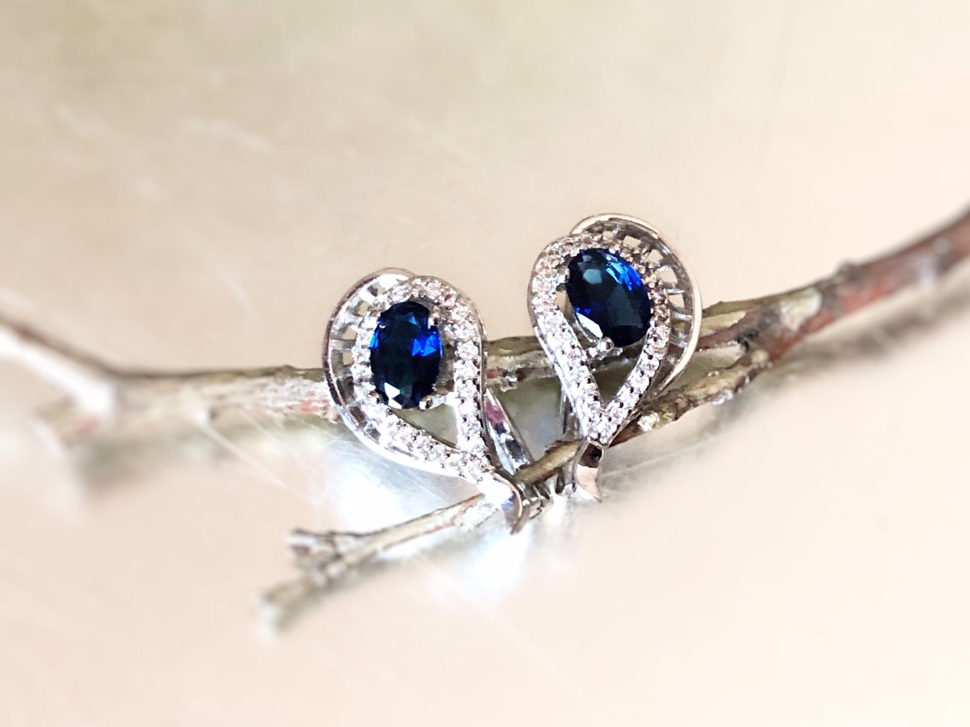 Oval sapphire lever back earrings with asymmetric created white sapphire pave detailing. Each oval created gemstone is 7x5mm. They are casted in 18K white gold over brass for lasting wear. Nickel free.