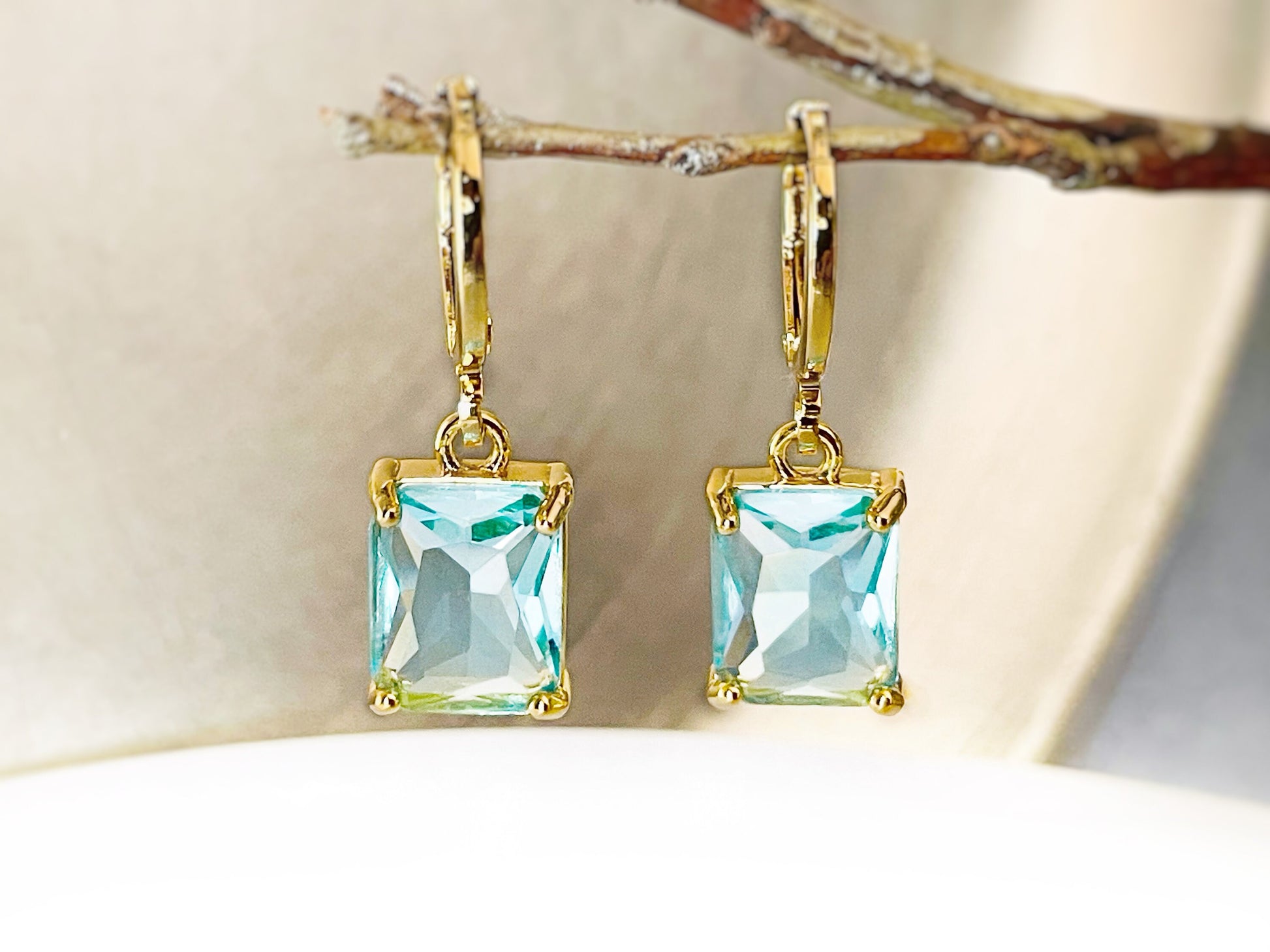 Small aquamarine emerald cut dangle earrings, light blue rectanglar gemstone drop earrings, gift for her, gift for girls, March birthstone