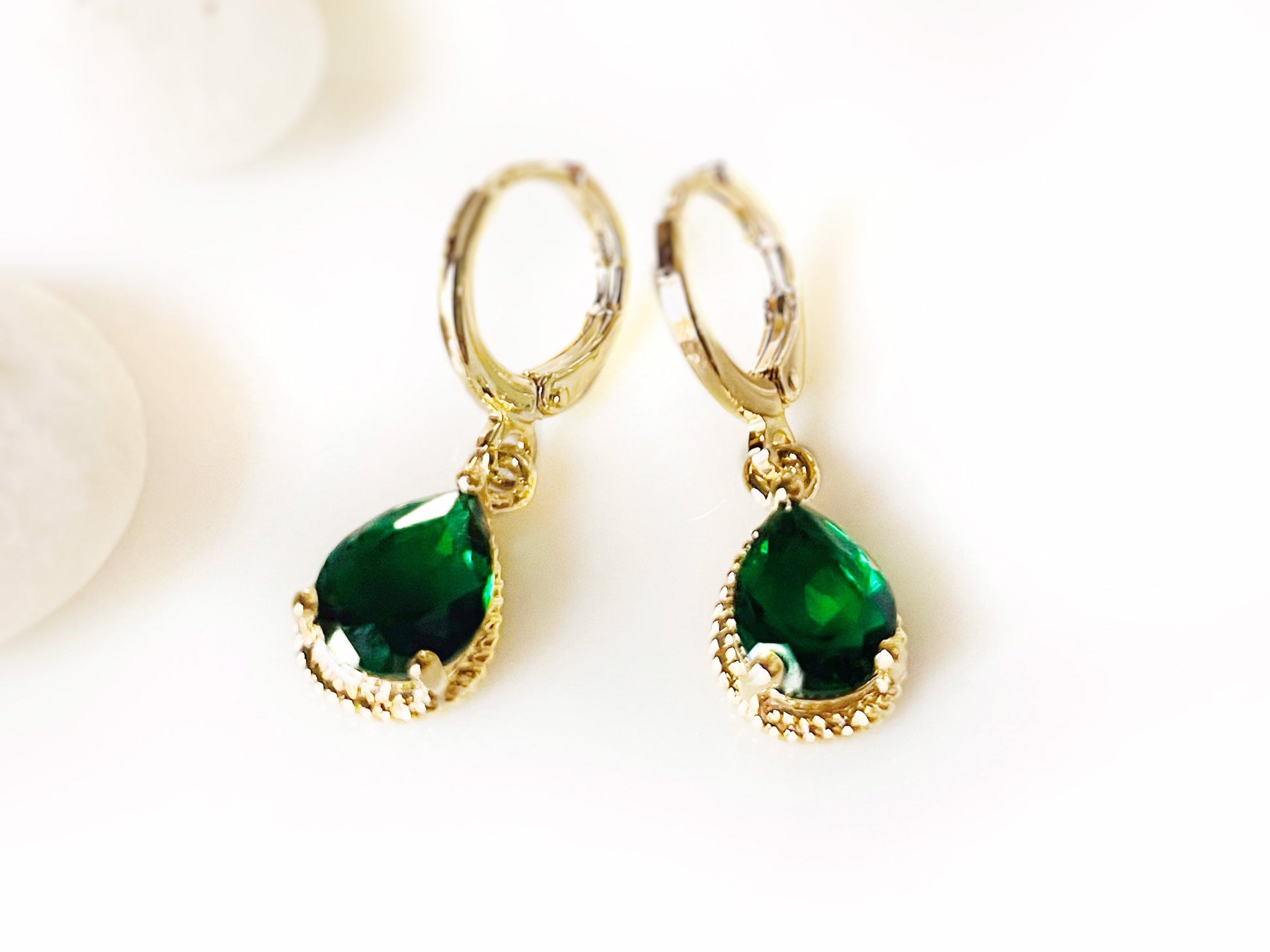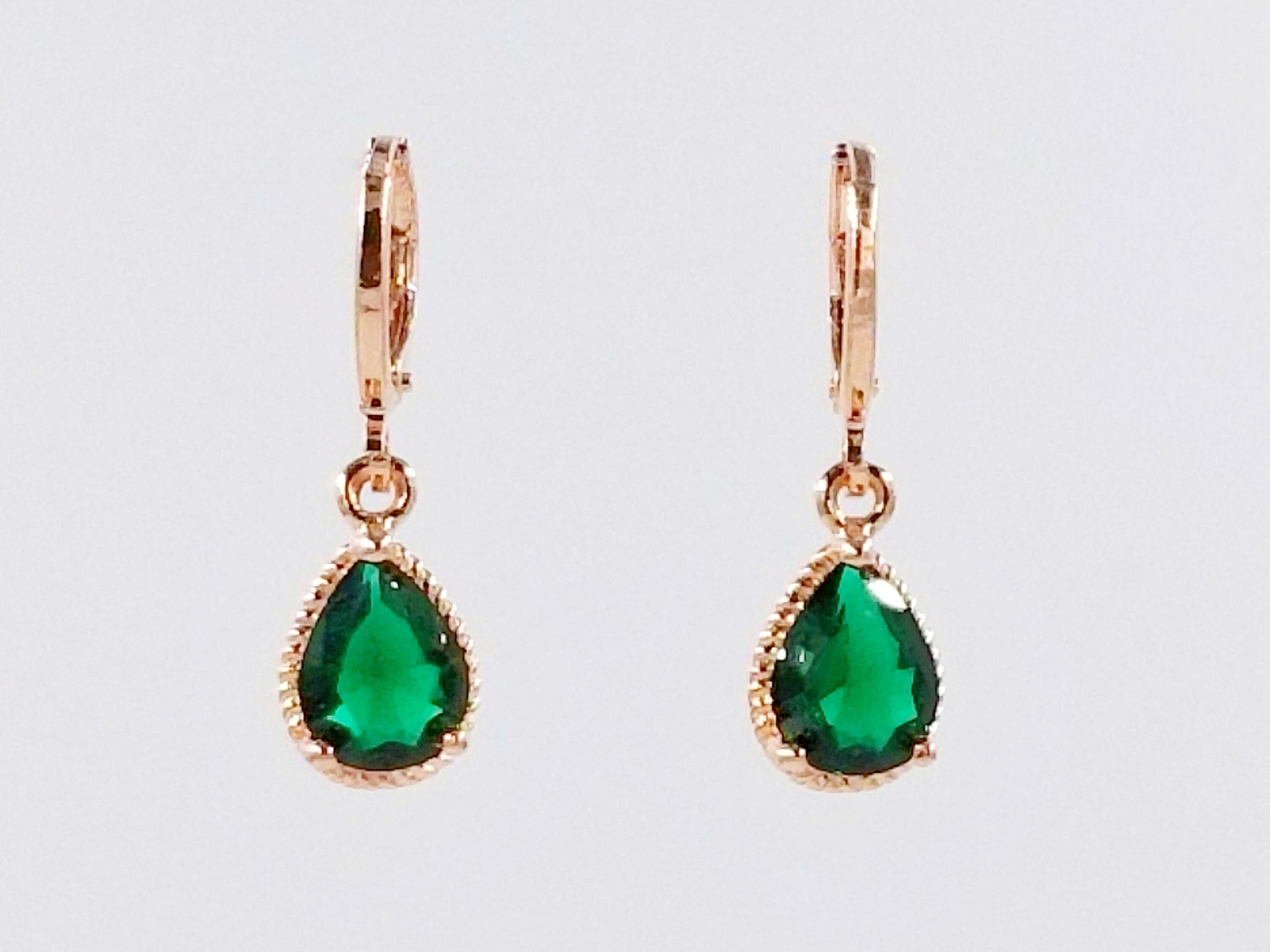 Small emerald teardrop bezel earrings crafted in 14 rose gold, 14K yellow gold or 18k white gold over brass. These created emerald gemstones are faceted for maximum sparkles. Each gemstone is 10x7mm. Light weight and elegant for any occasion.