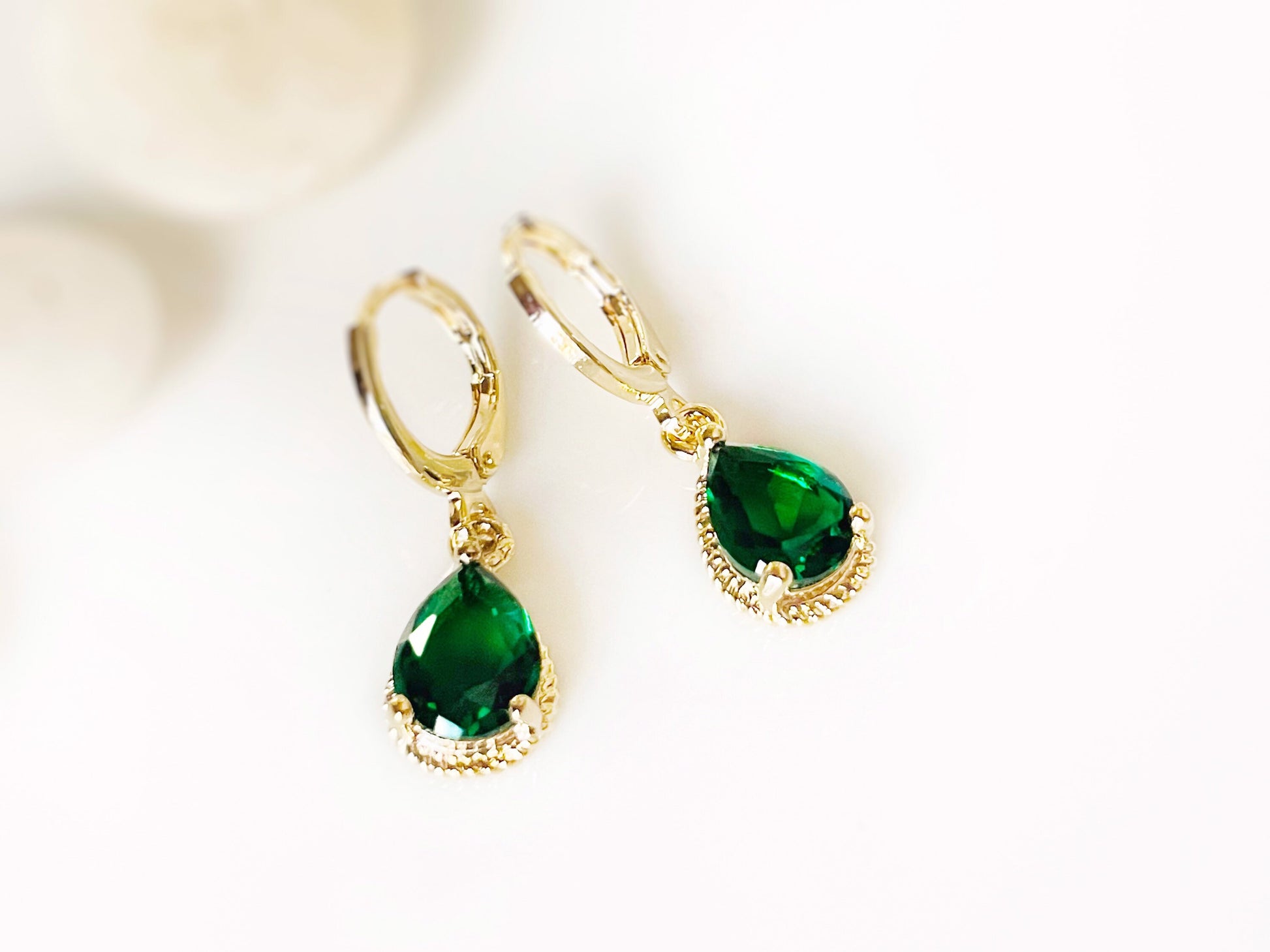Small emerald bezel earrings, green teardrop gemstone dangle earrings, gift for her, gift for girls, May birthstone