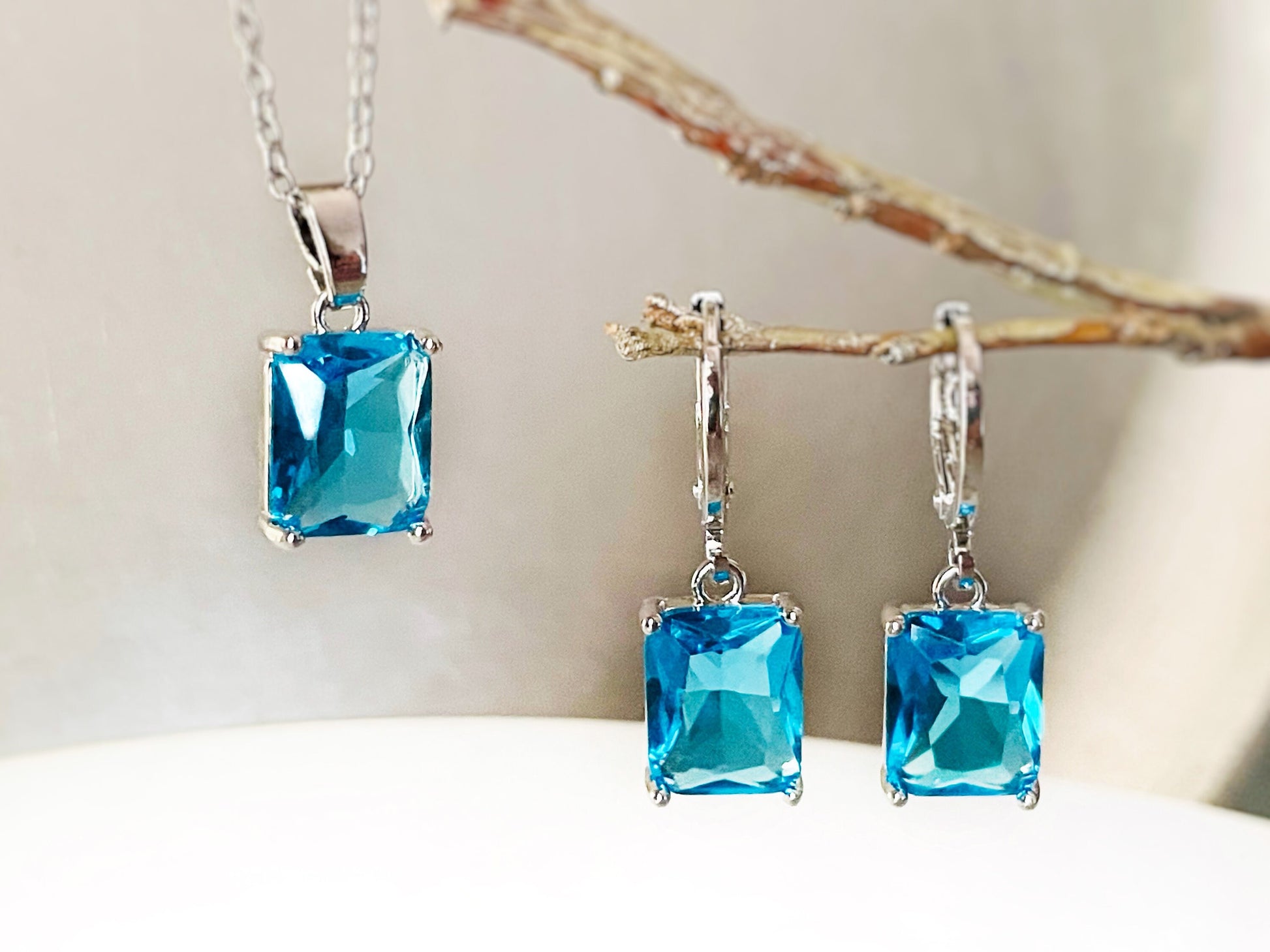 2pc Blue Topaz 2pc Jewelry Set, Small Emerald Cut Pendant Neckalce & Matching Dangle Earrings. Each created blue topaz gemstone is faceted 10x7mm emerald cut with lots of sparkles. Lead and nickel free.