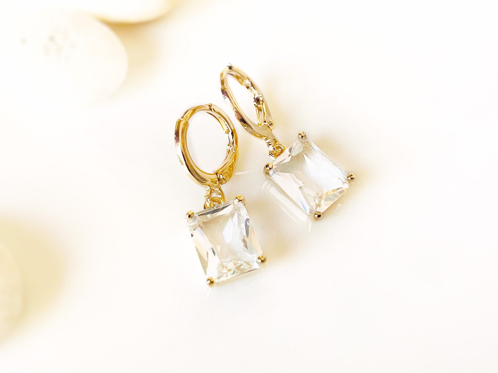 Small emerald cut white sapphire dangle earrings set in 14k gold, 18k white gold or 14k rose gold over brass. Each created white sapphire is 10x7mm faceted for maximum sparkles, dangles from small 12mm huggies. Simple and light weight for any occasion.