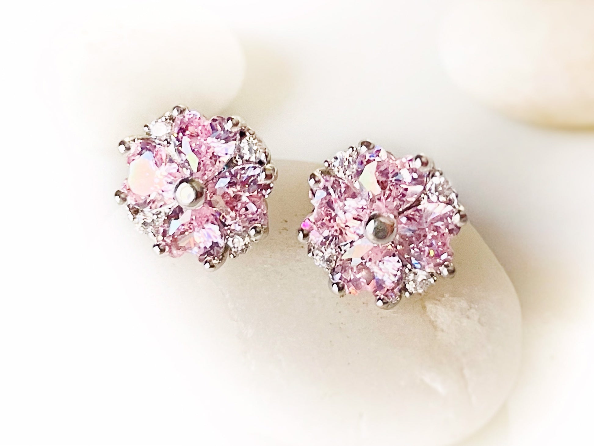 Pink sapphire flower stud earrings casted 18K white gold or 14K yellow gold plating over brass with 925 sterling silver posts. These beautiful earrings each consists of 4 heart shaped (5x4mm) created pink sapphires and 4 round (1mm) created white sapphires.