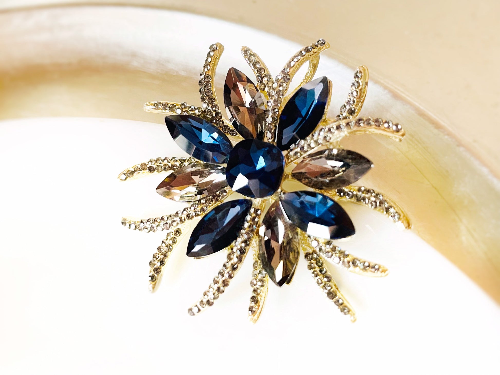Large starburst crystal statement brooch casted in gold plated. This beautiful statement brooch has clustered crystals in sapphire blue and charcoal grey colors.