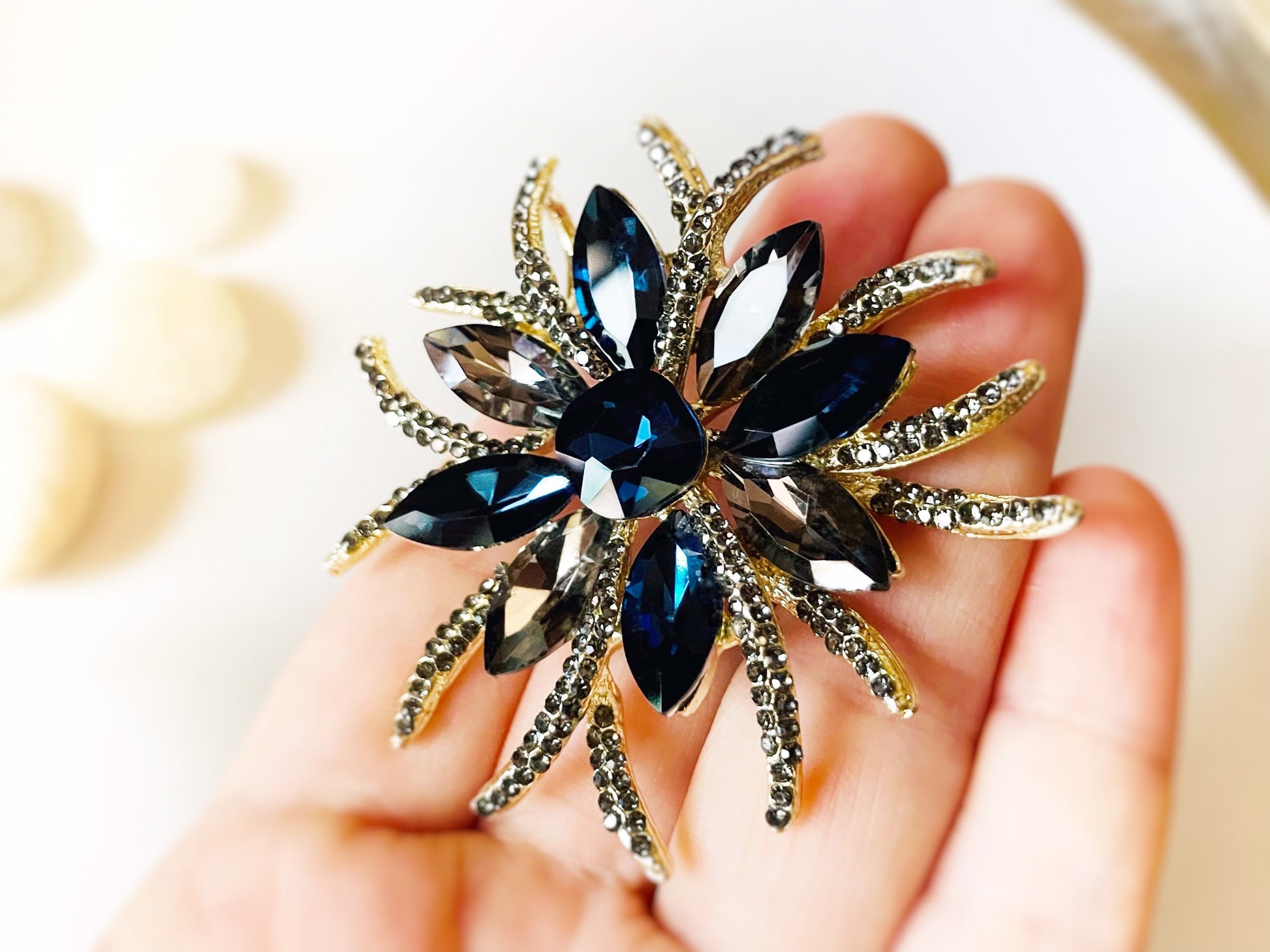 Large starburst fancy crystal statement brooch casted in gold plated. This beautiful statement brooch has clustered crystals in maroon pink and charcoal grey colors.
