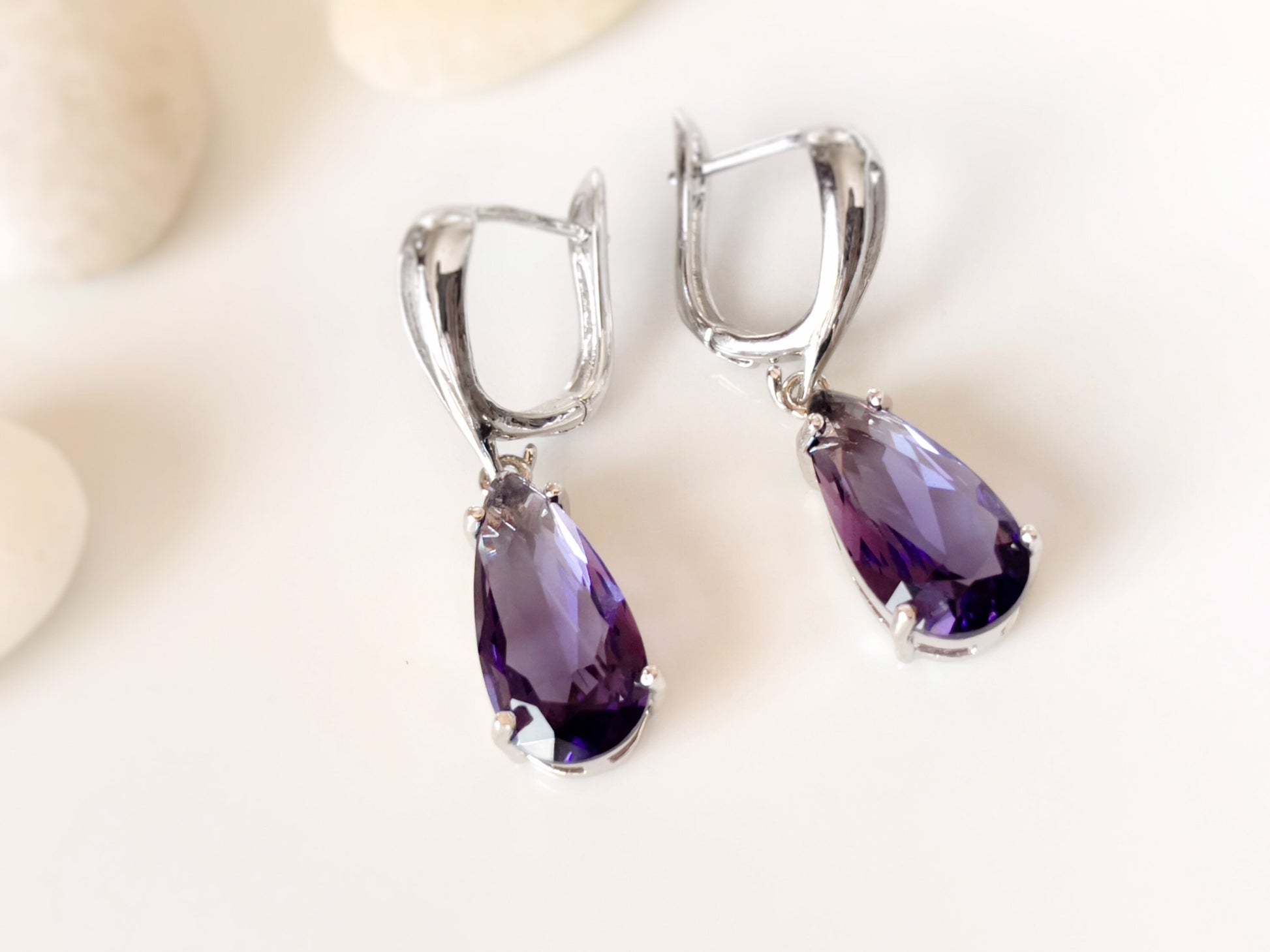 Teardrop amethyst dangling earring in 18K white gold, amethyst drop earrings, gift for her, gift for mom, February birthstone