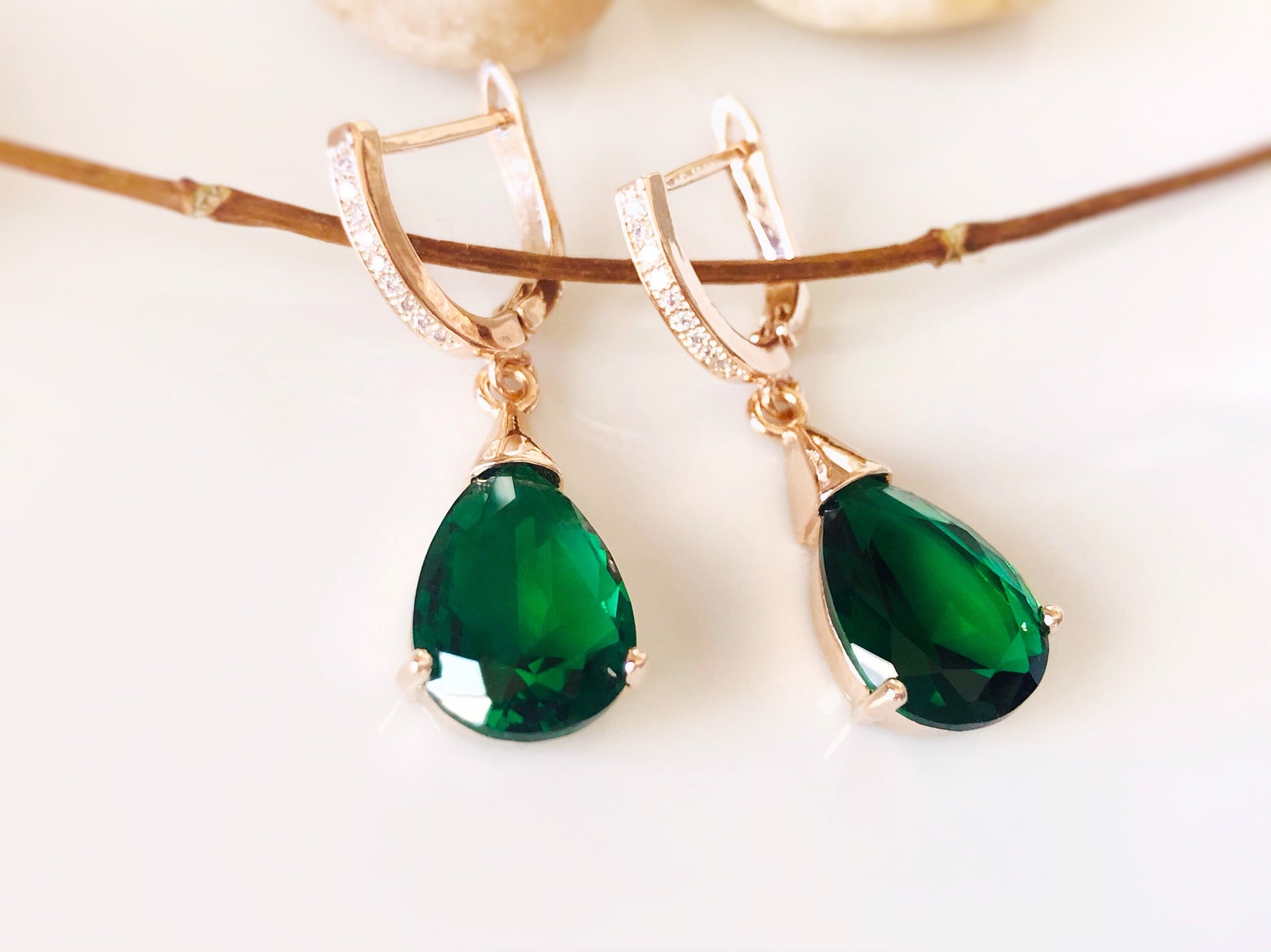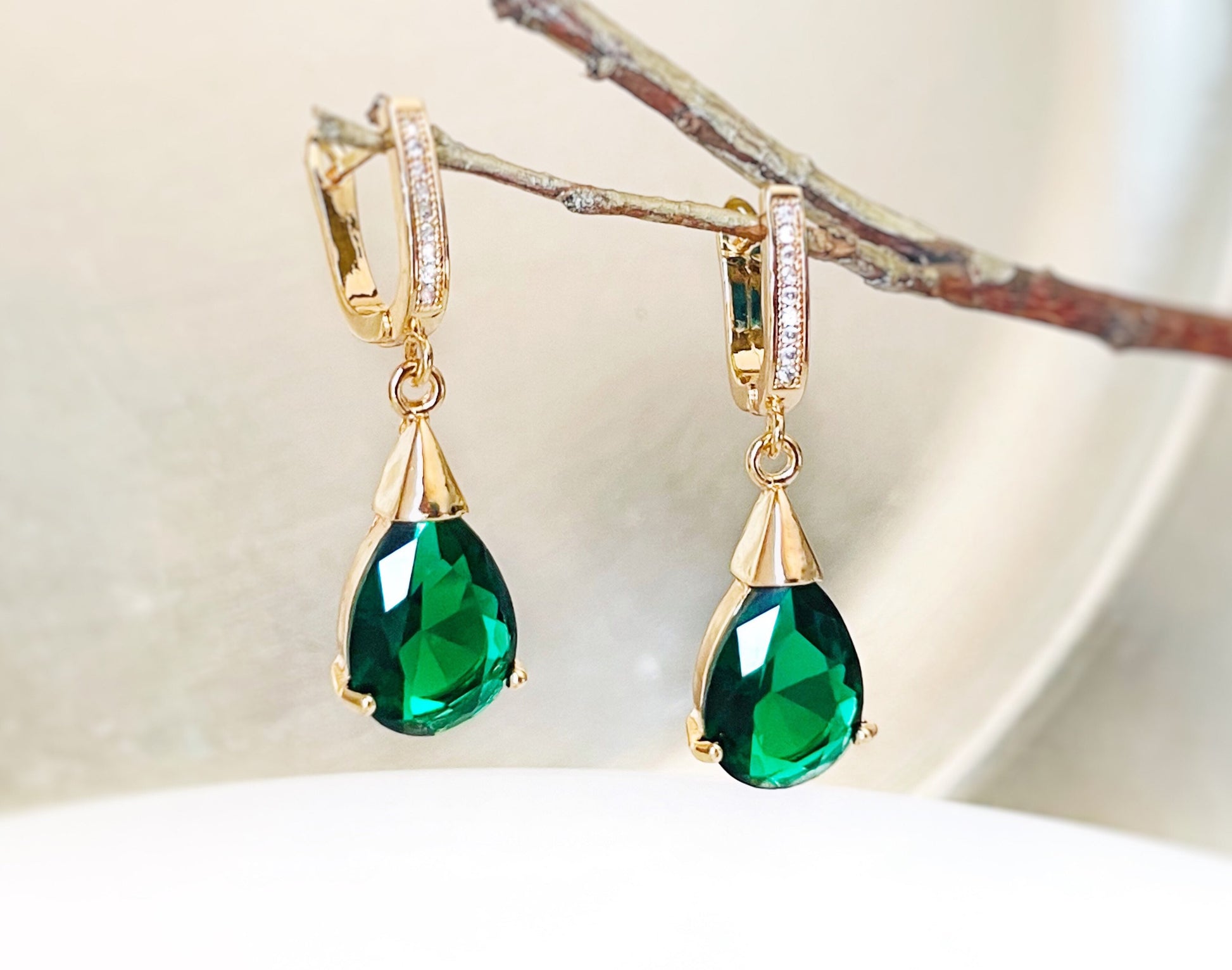 Teardrop emerald dangle earrings with white sapphire accented lever backs. These beautiful earrings showcase 14x10mm teardrop created emerald green gemstones crafted in polished 18K white gold, 14k rose gold or 14k yellow gold over brass. They are perfect gifts for your bridesmaids for the wedding and beyond.