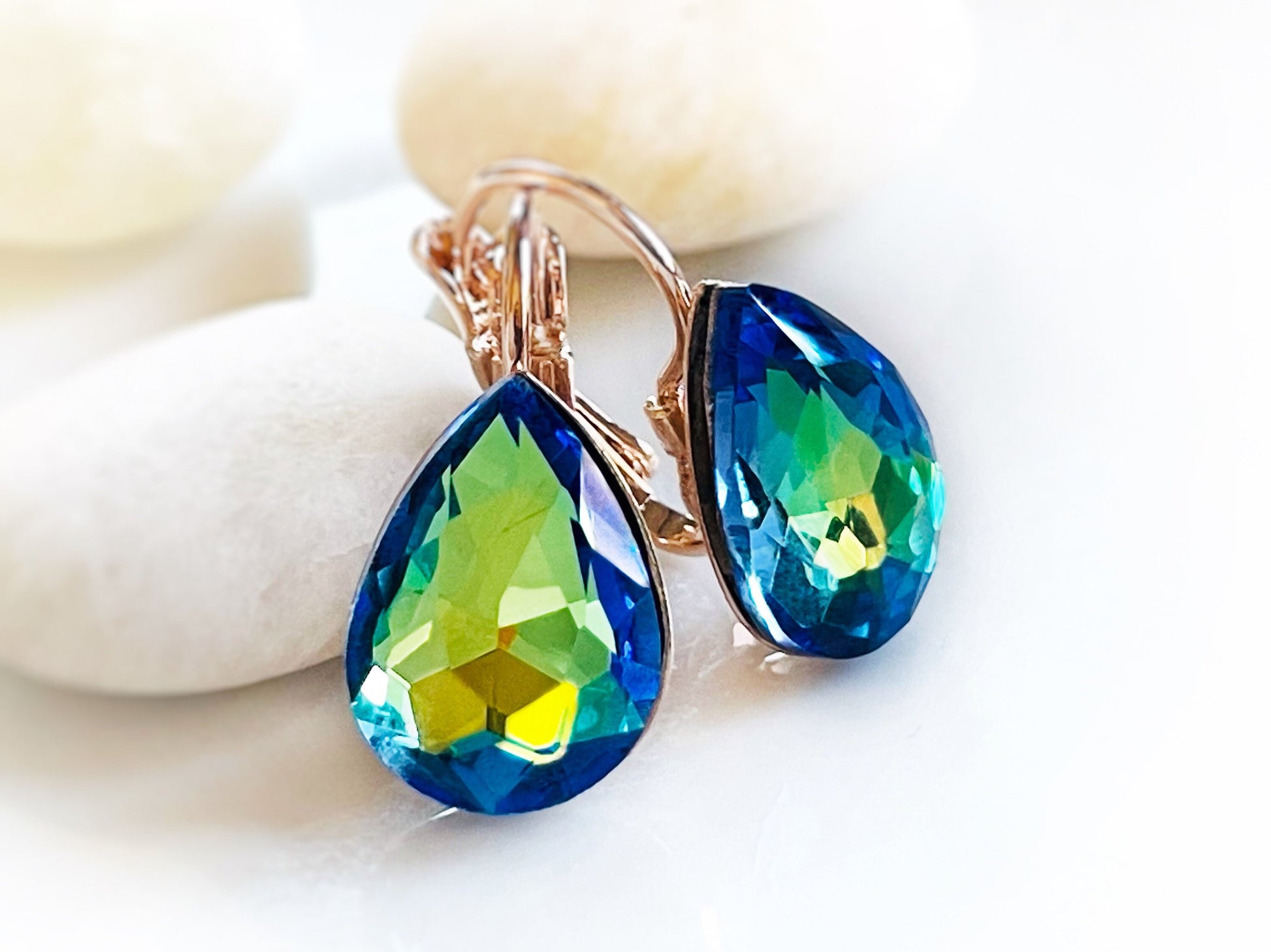 Teardrop fancy crystal Stud earrings, fancy crystal stud lever back, green blue crystal solitaire, gift for mom, bridal earrings