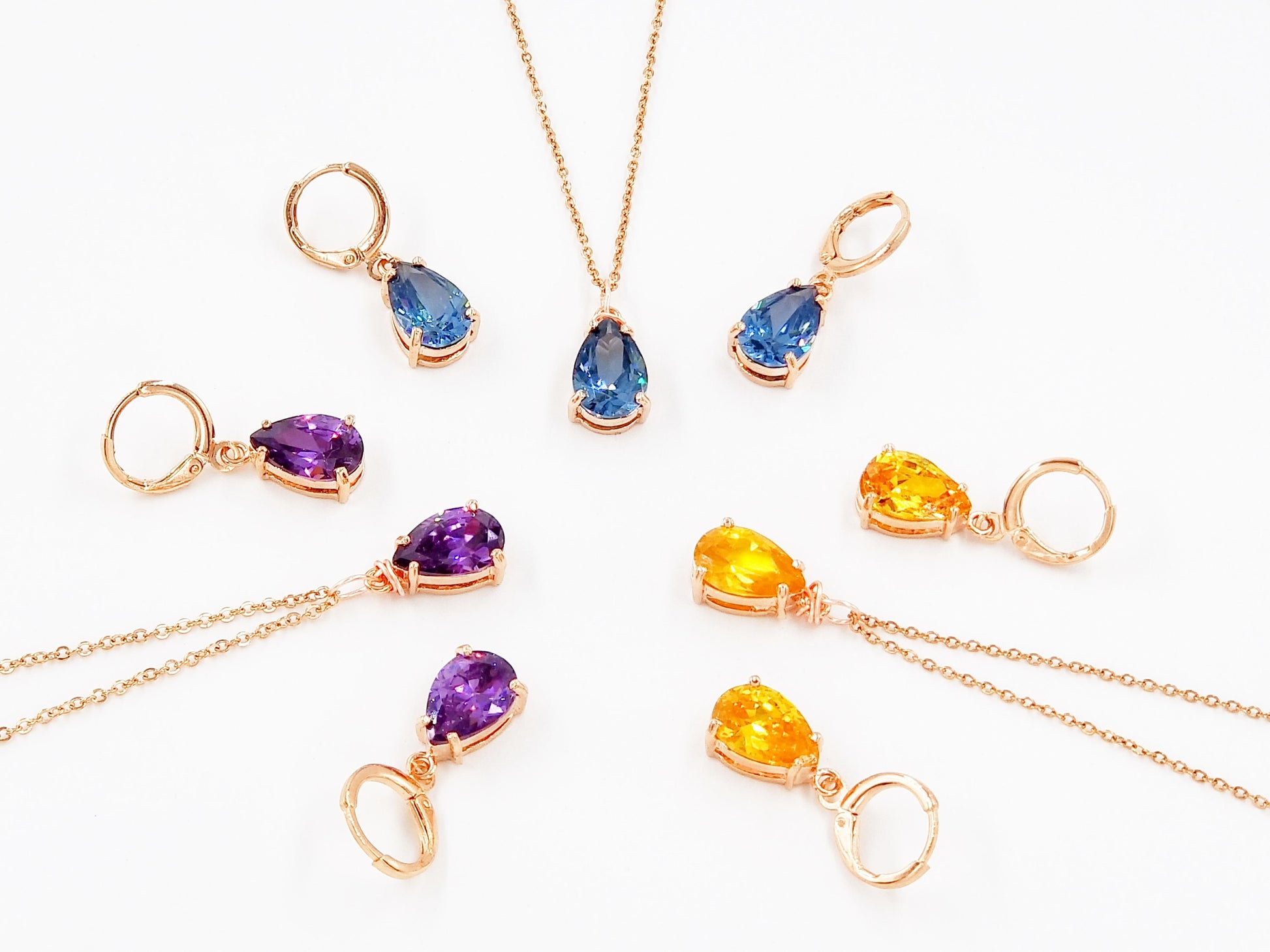 2-Pc Set Teardrop Created Gemstone Pendant Neckalce & Matching Drop Earrings in 14K rose gold, 14k yellow gold or 18k white gold over brass. Lead, nickel and allergy free.