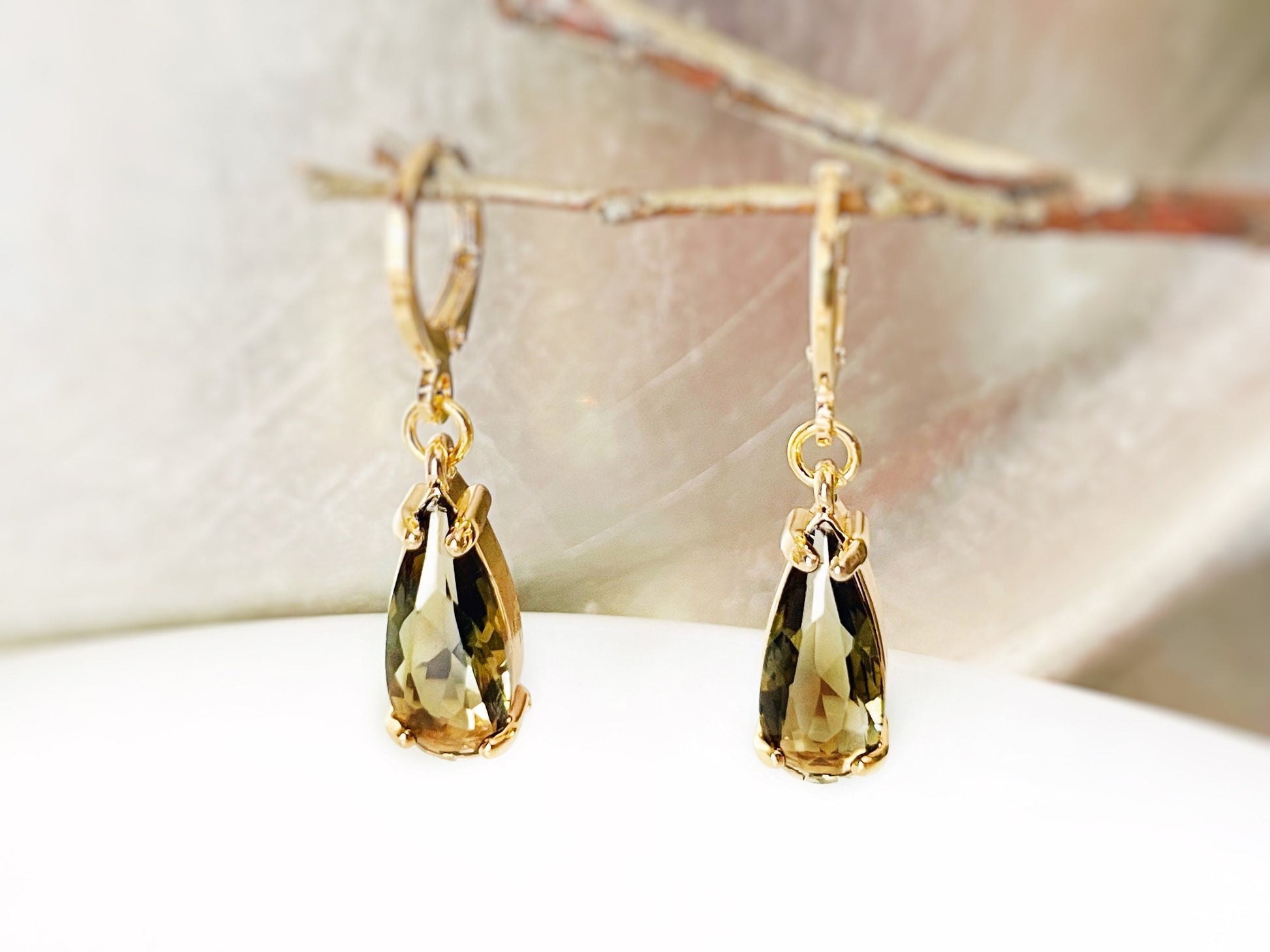 Teardrop peridot gemstone dangle earrings gold, elongated olive green gemstone gold, gift for her, august birthstone earrings