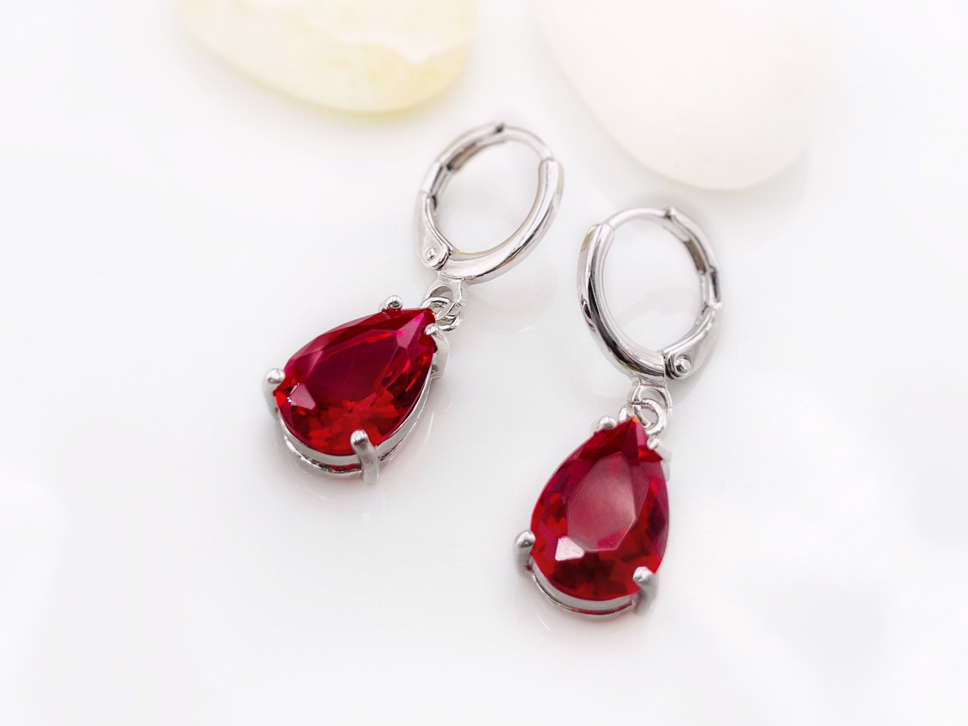 Teardrop created ruby gemstone dangling earrings crafted in 14k rose gold, 14k yellow or 18k white gold plating over brass. Each earring dangle features a 13.0 x 8.0mm teardrop. Lead and nickel free.