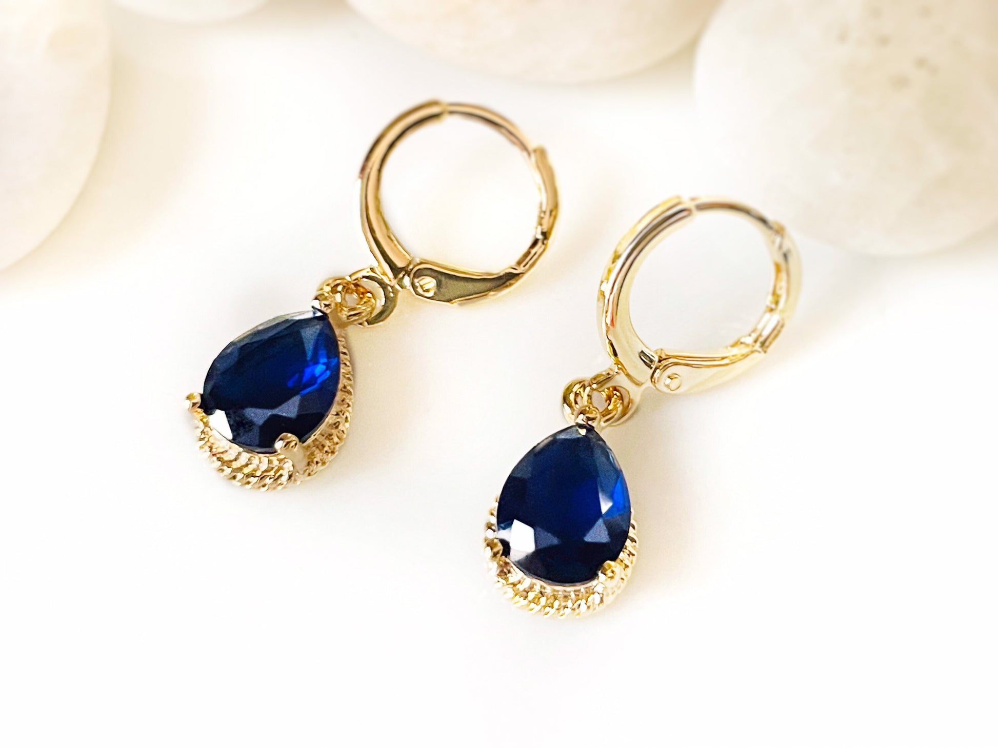 Teardrop sapphire dangle huggie earrings, sapphire blue gemstone earrings, gift for her, gift for daughter, September birthstone earrings