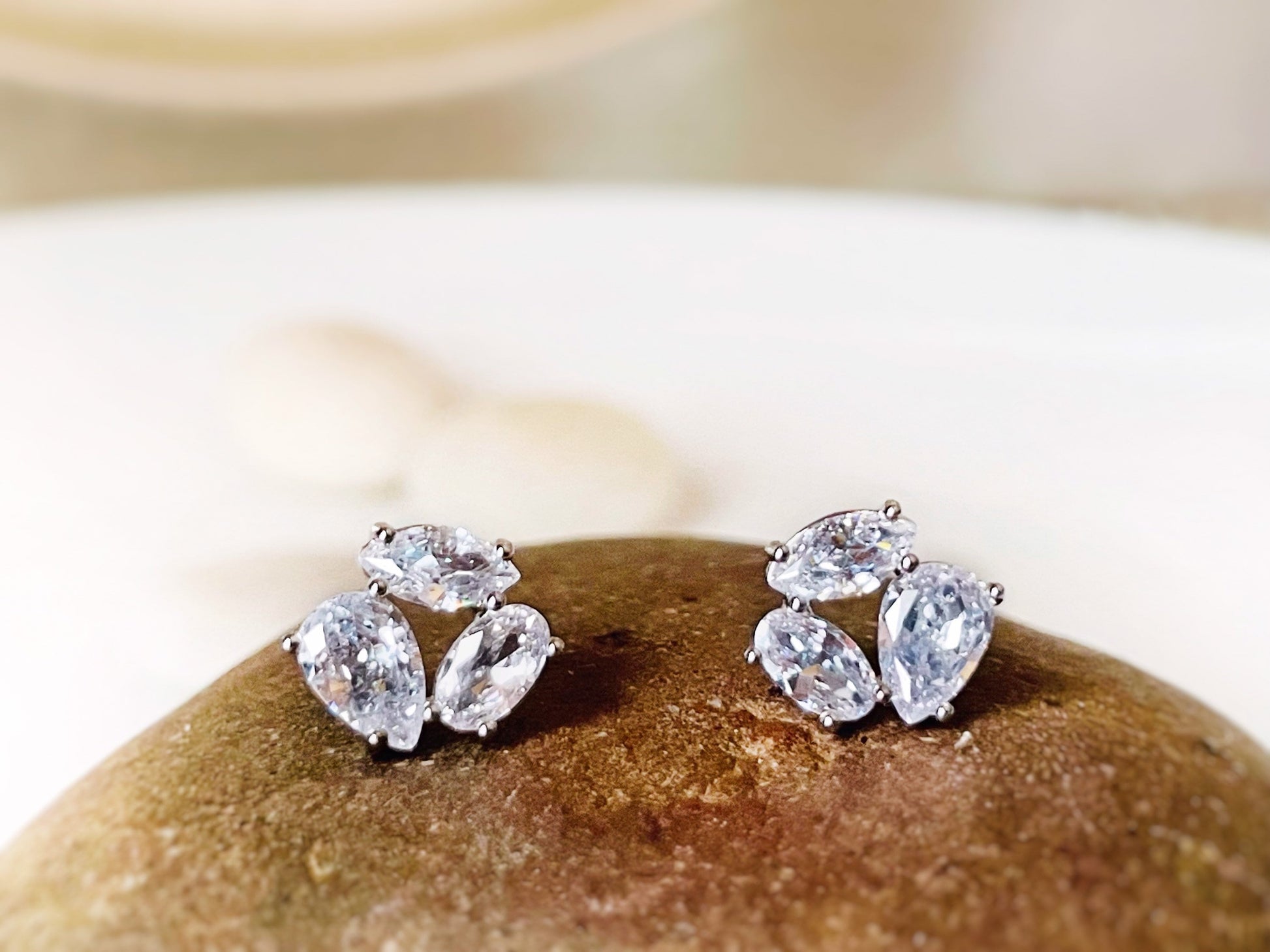 White sapphire small cluster three stone stud earrings set in 18k white gold filled over brass. The cluster of created white sapphire gemstones consists of a 7x5mm teardrop, 7x3mm marquise cut and 5x2.5mm oval, all faceted for maximum sparkles.