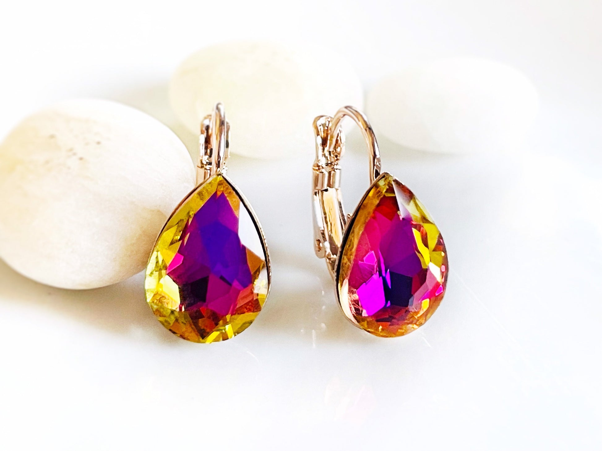 Volcano Fancy crystal Stud earrings, fancy crystal lever back, yellow pink crystal solitaire, gift for mom, bridal earrings