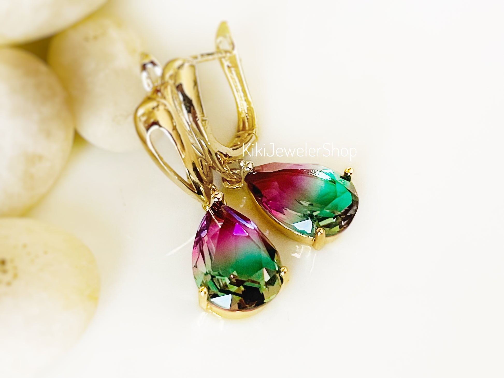 Bicolor gemstone tourmaline earrings crafted in 14K rose gold, 14K yellow gold or 18k white gold plated. These beautiful earring dangles are crafted with (14x10mm) created gemstones faceted for maximum sparkles. Lead and nickel free.