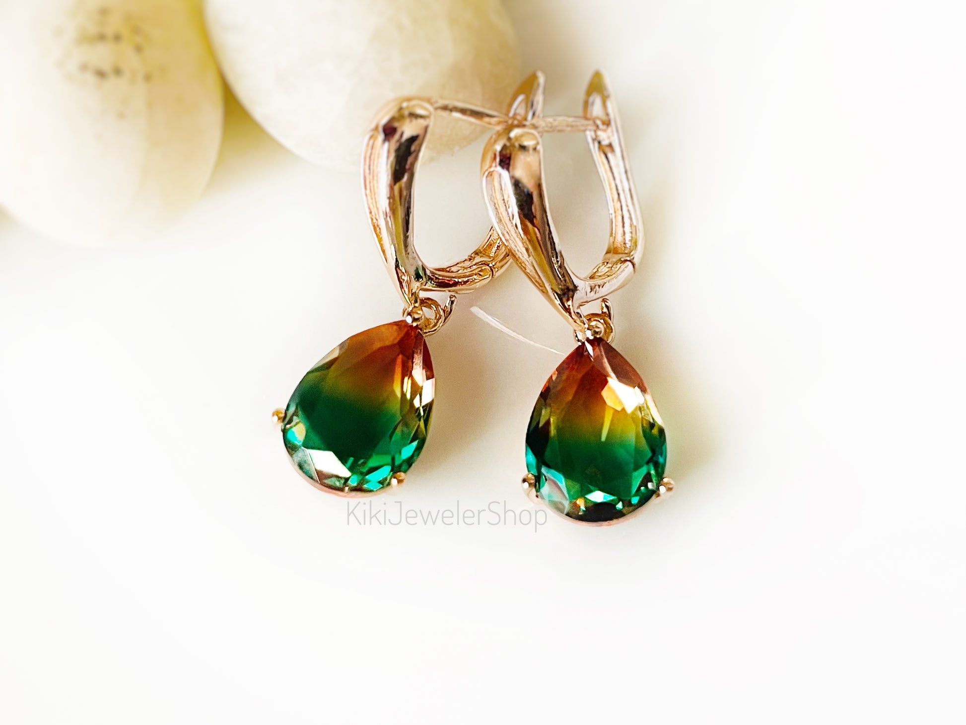 Bicolor gemstone tourmaline earrings crafted in 14K rose gold, 14K yellow gold or 18k white gold plated. These beautiful earring dangles are crafted with (14x10mm) created gemstones faceted for maximum sparkles. Lead and nickel free.