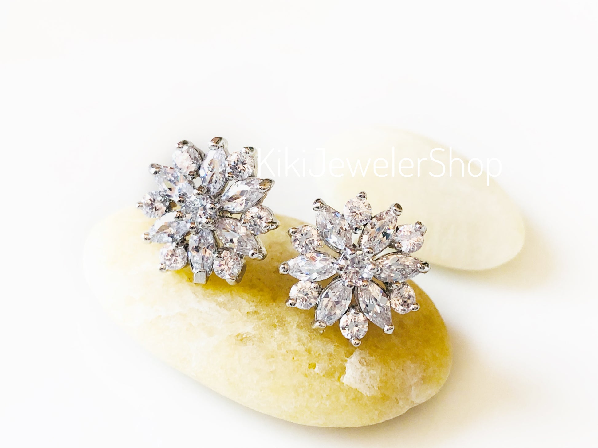 Beautiful snowflake stud earrings with round and Marquise cut created white sapphires. Each earring measures 14mm diameter. They are casted in 14k gold, 14k rose gold or 18k white gold over brass for lasting wear.