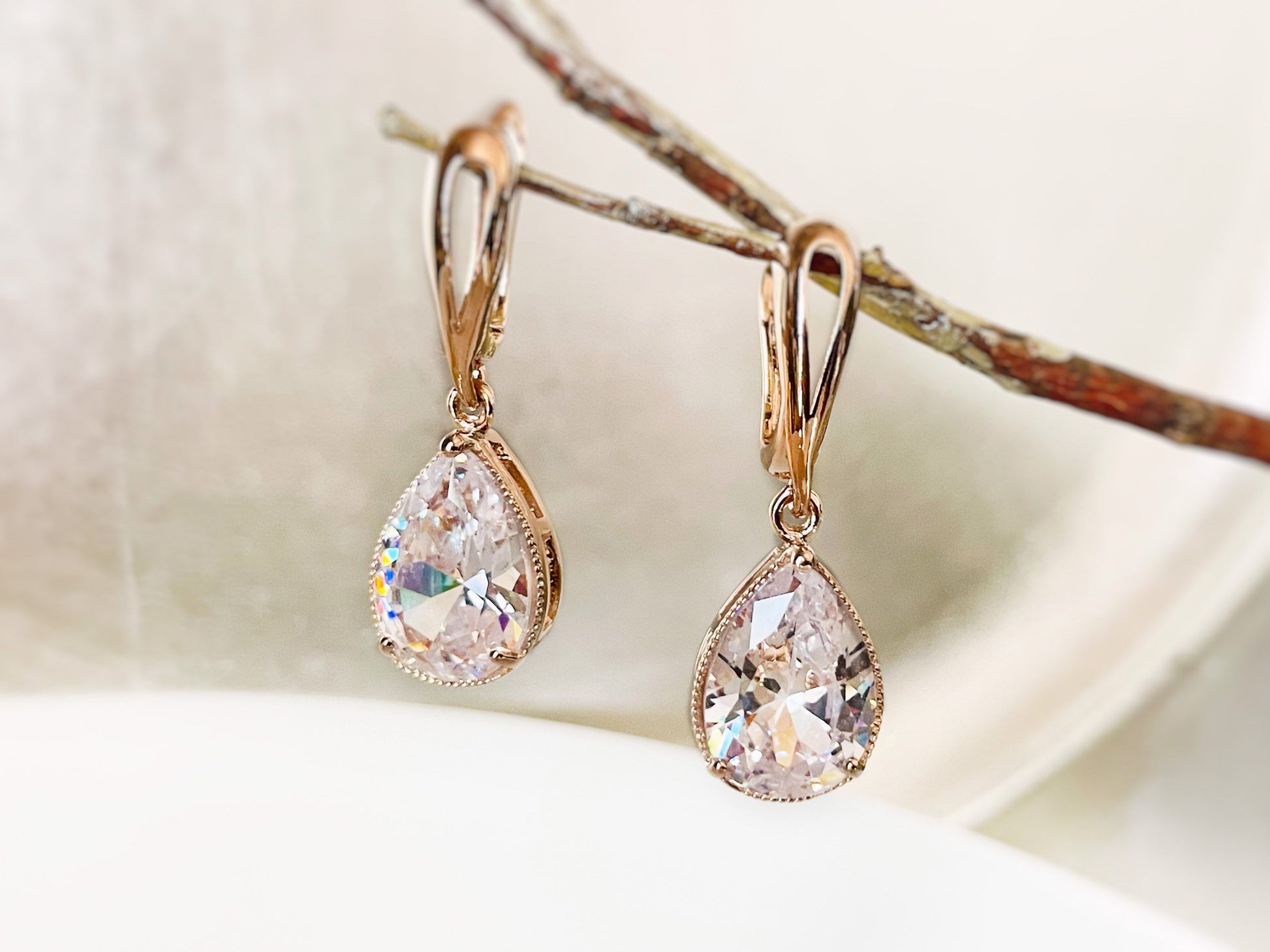 Large teardrop white sapphire dangle earrings casted in 14K yellow gold, 14k rose gold or 18k white gold over brass secured with lever backs. These classic teardrop created white sapphire stones are 14x10mm faceted for maximum sparkles. They are perfect for day to evening elegance.
