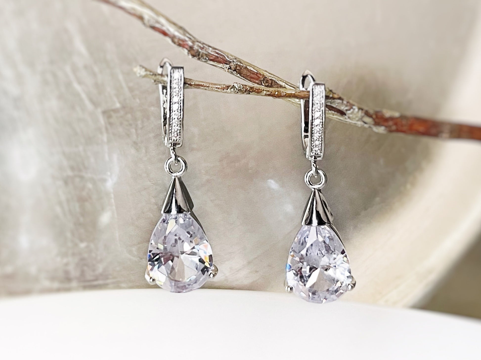 White sapphire teardrop dangle earrings, white gemstone drop earrings, bridal earrings, gift for her, gift for mom, April birthstone